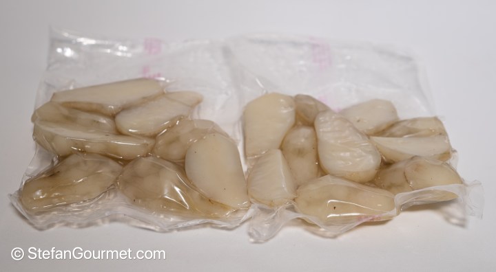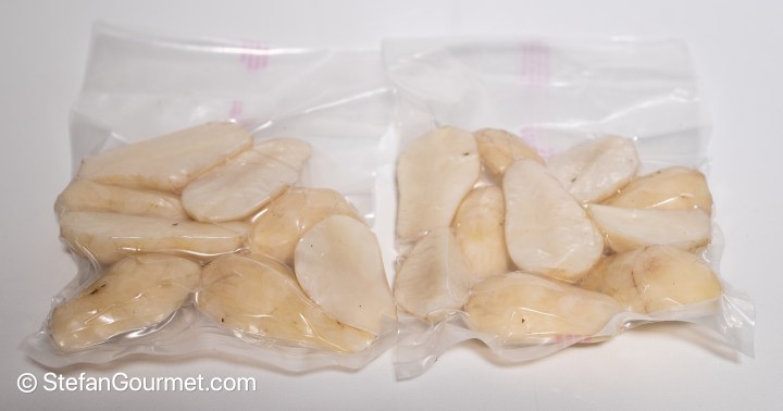 Peel the sunchokes, cut them into chunks, and vacuum seal. Make sure the thickness of the bag does not exceed 2.5 centimeters (1 inch), as otherwise a longer cooking time will be needed.