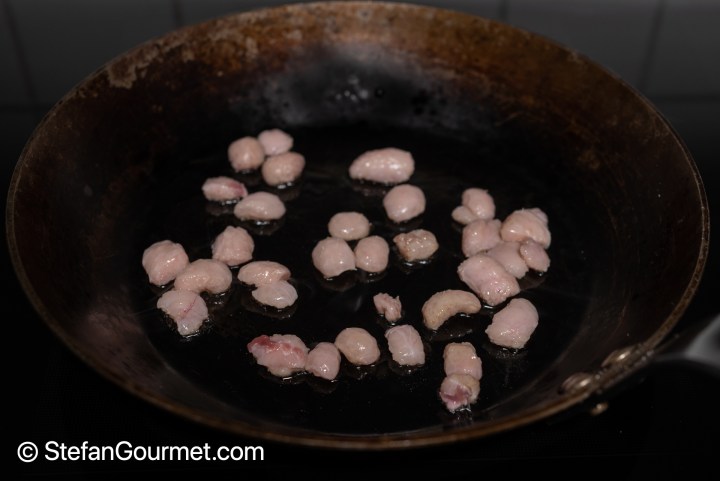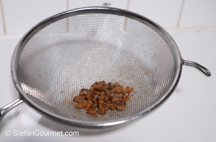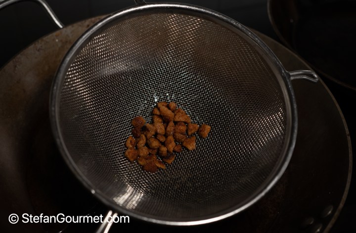 Keep going until the duck crackling is crispy and golden brown. Keep some of the rendered duck fat in the small frying pan (about 1/2 tablespoon), but put most in the large frying pan.