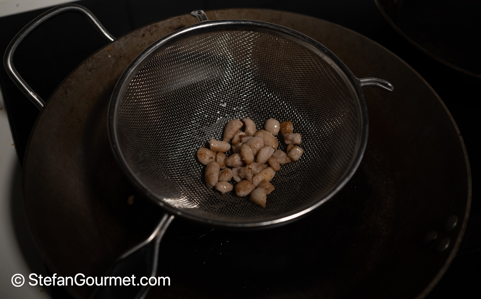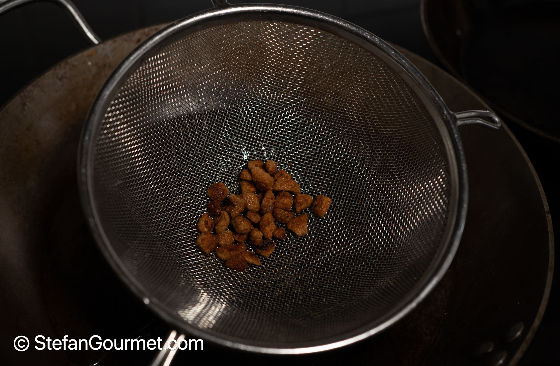 Strain the fat that will render out of the duck skin into a large frying pan a couple of times, and return the duck fat bits to the small frying pan to render them some more.