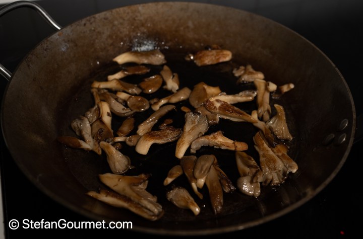 Stir fry the mushrooms until they are cooked and golden brown. Season the mushrooms with salt when they are done, not before.