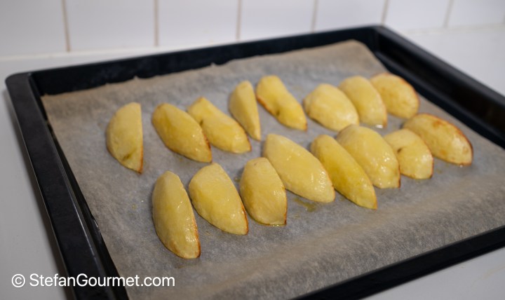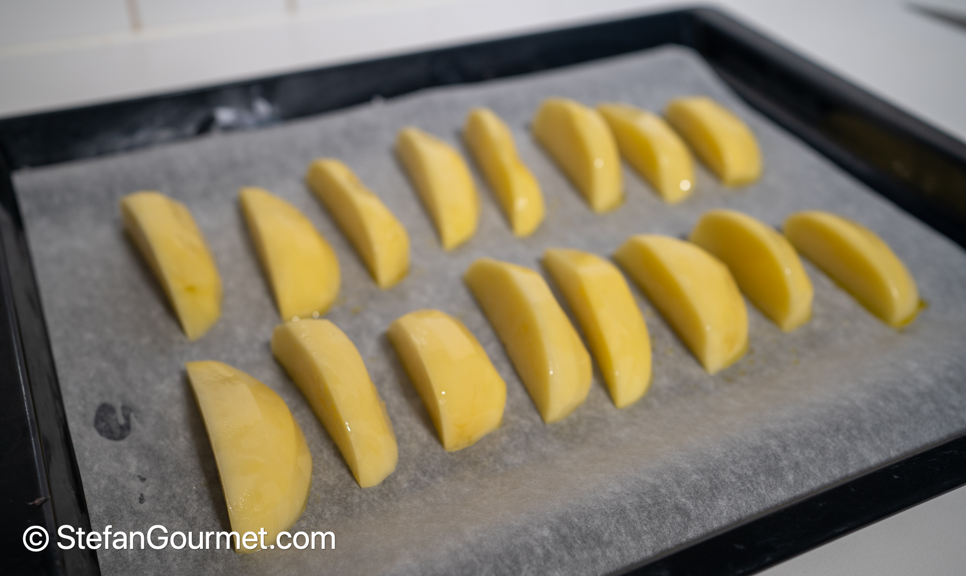 Preheat the oven to 225C/440F. Peel the potato and cut into wedges. Toss the wedges with olive oil until they are covered on all sides. Arrange the potato wedges on a baking sheet lined with oven paper.