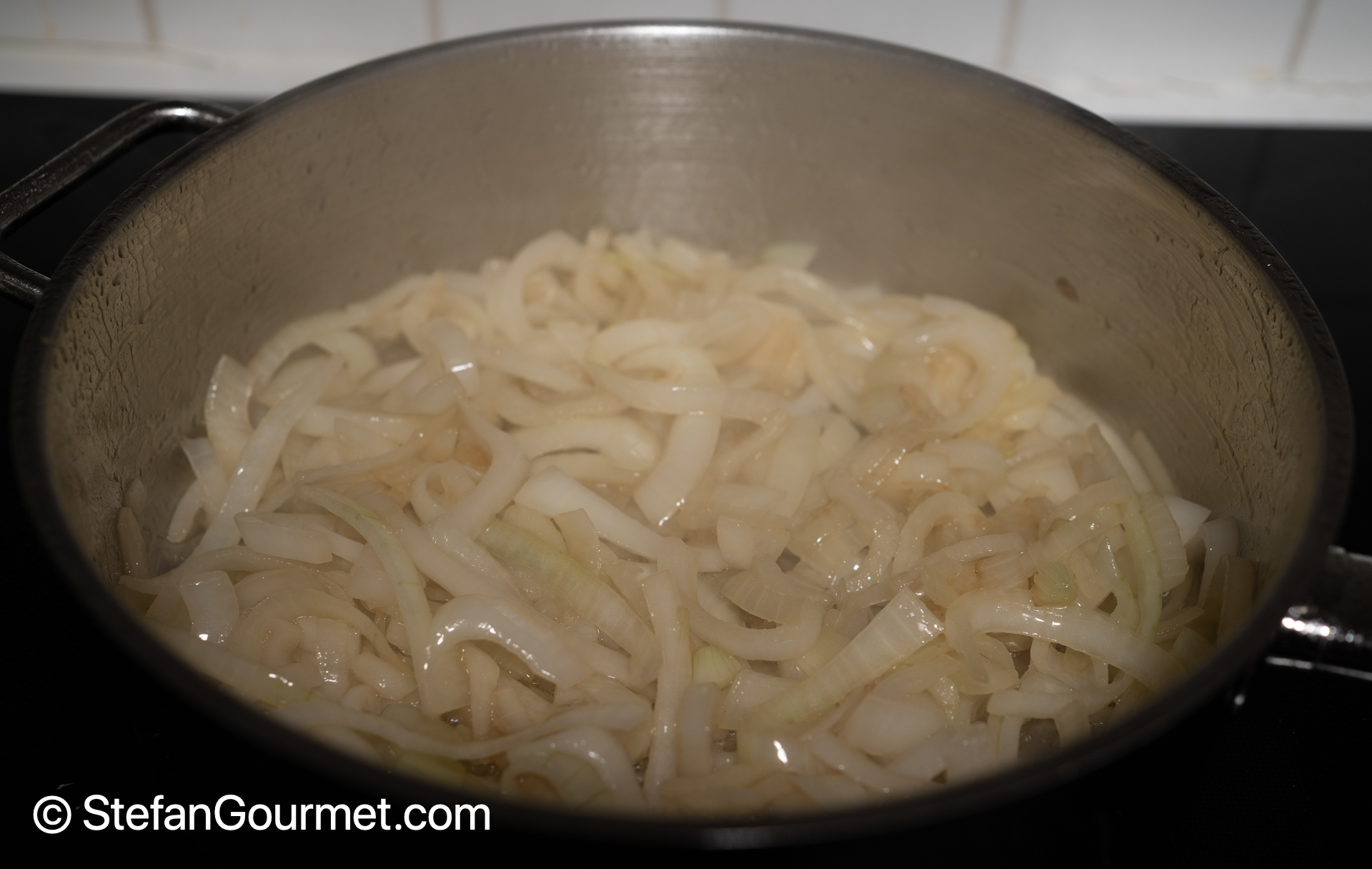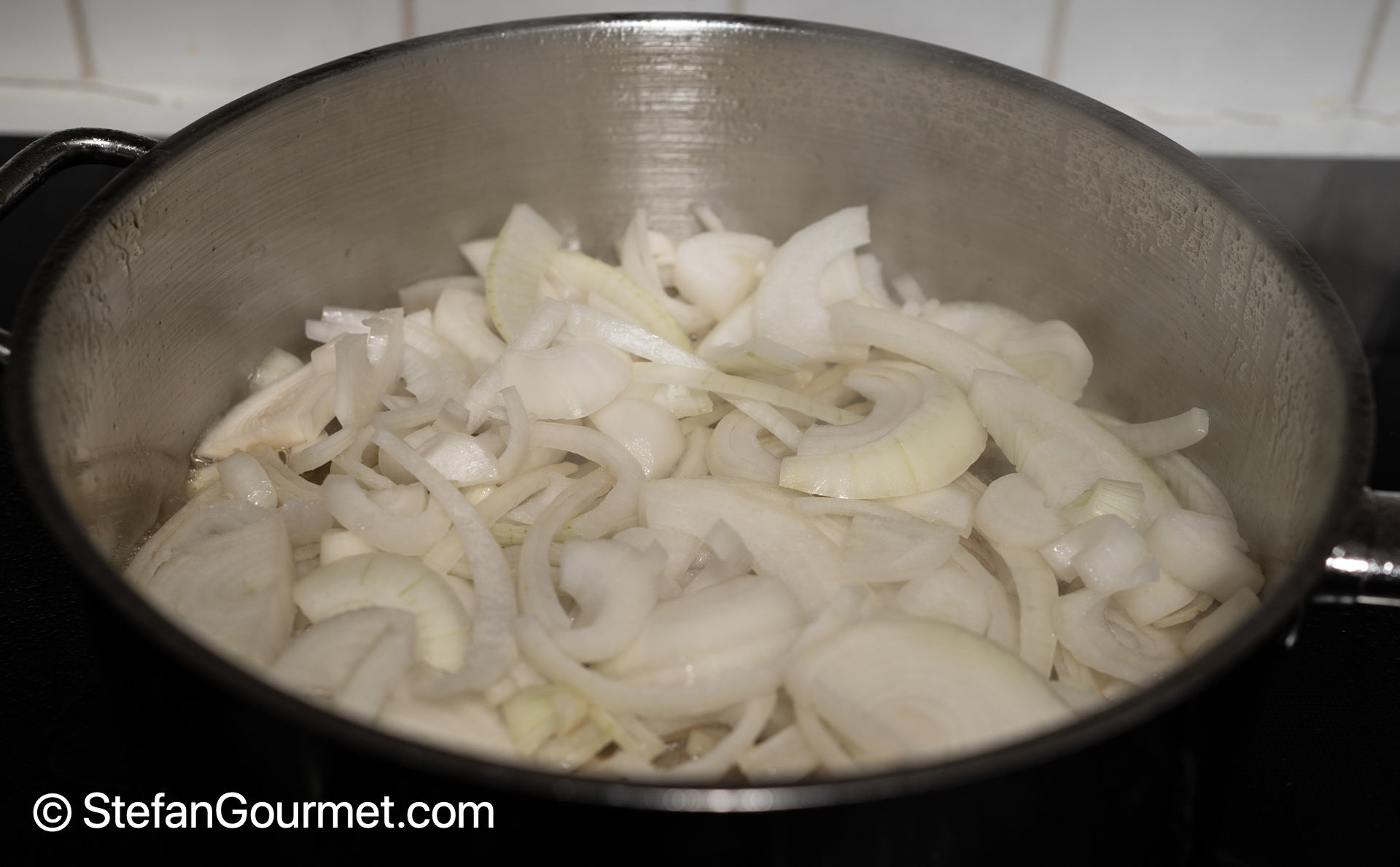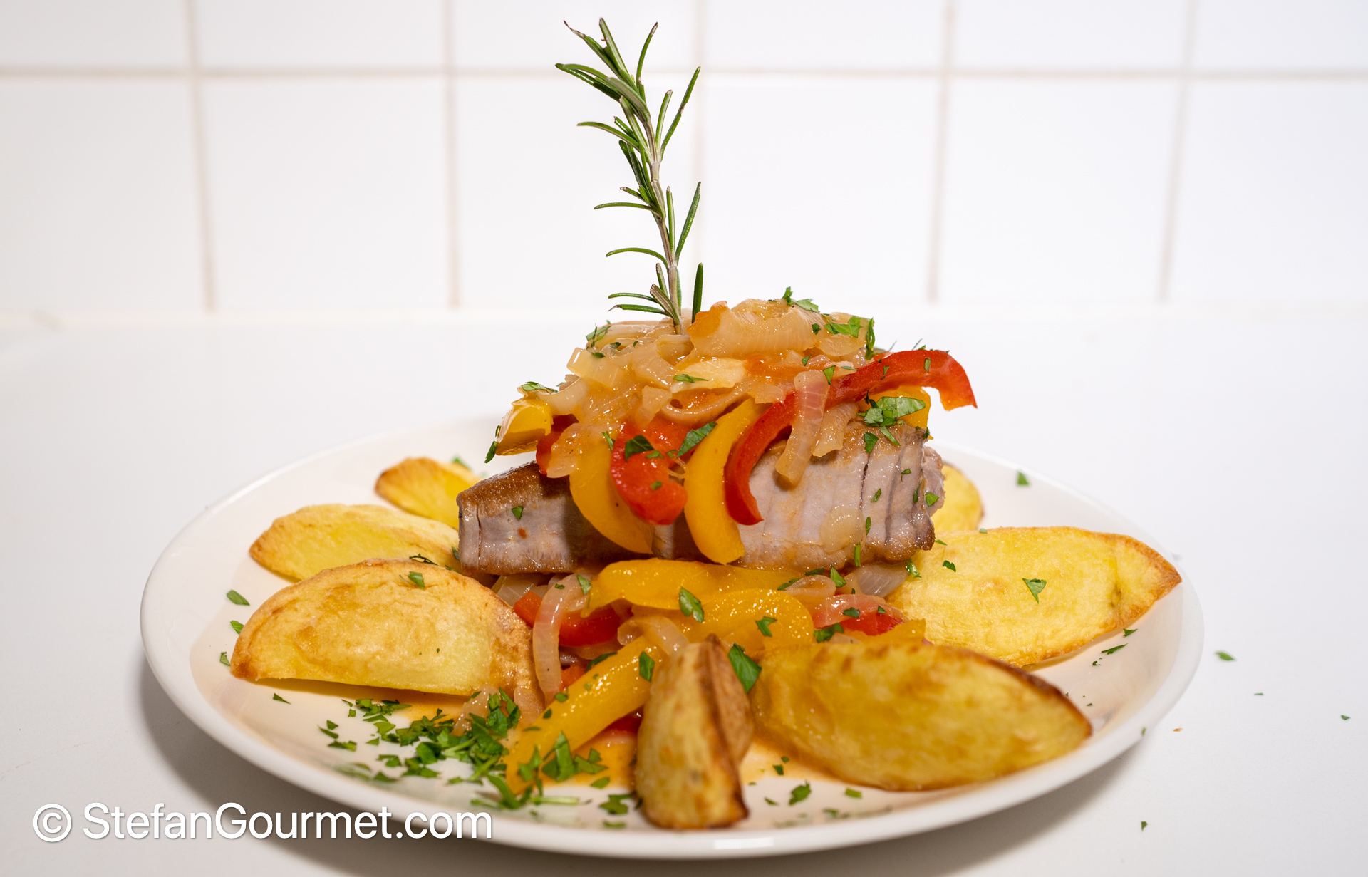 Tuna is locally caught along the Algarve in Southern Portugal, and so the local cuisine also includes recipes for tuna. Cebolada de atum is one of the most common dishes. The name “cebolada” refers to the onions in the dish and there are many variations of this recipe. I tried the dish at restaurant Ponto de Encontro in Tavira and their version included bell pepper and the tuna was braised. Braised tuna doesn’t sound as good as it actually was, as it was tender and juicy. This was probably due to the quality of the tuna; I suspect it was from the belly and therefore fatty enough. You could also just sear the tuna and keep it rare inside, and still serve it with the braised onions and bell peppers.