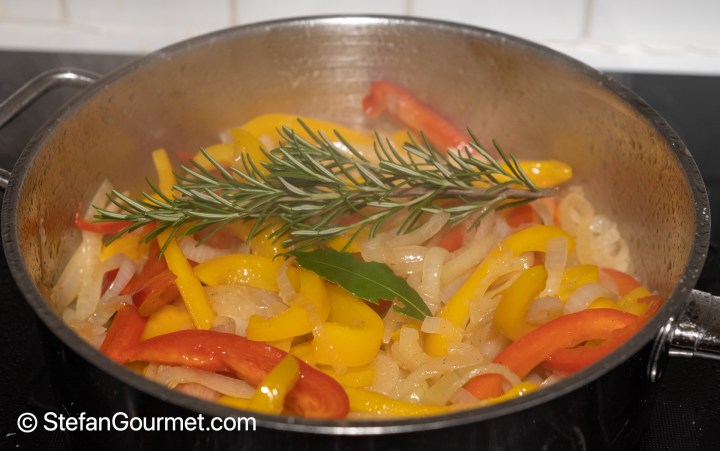Cover and cook over medium heat, stirring regularly, until the peppers are tender but still firm to the bite.