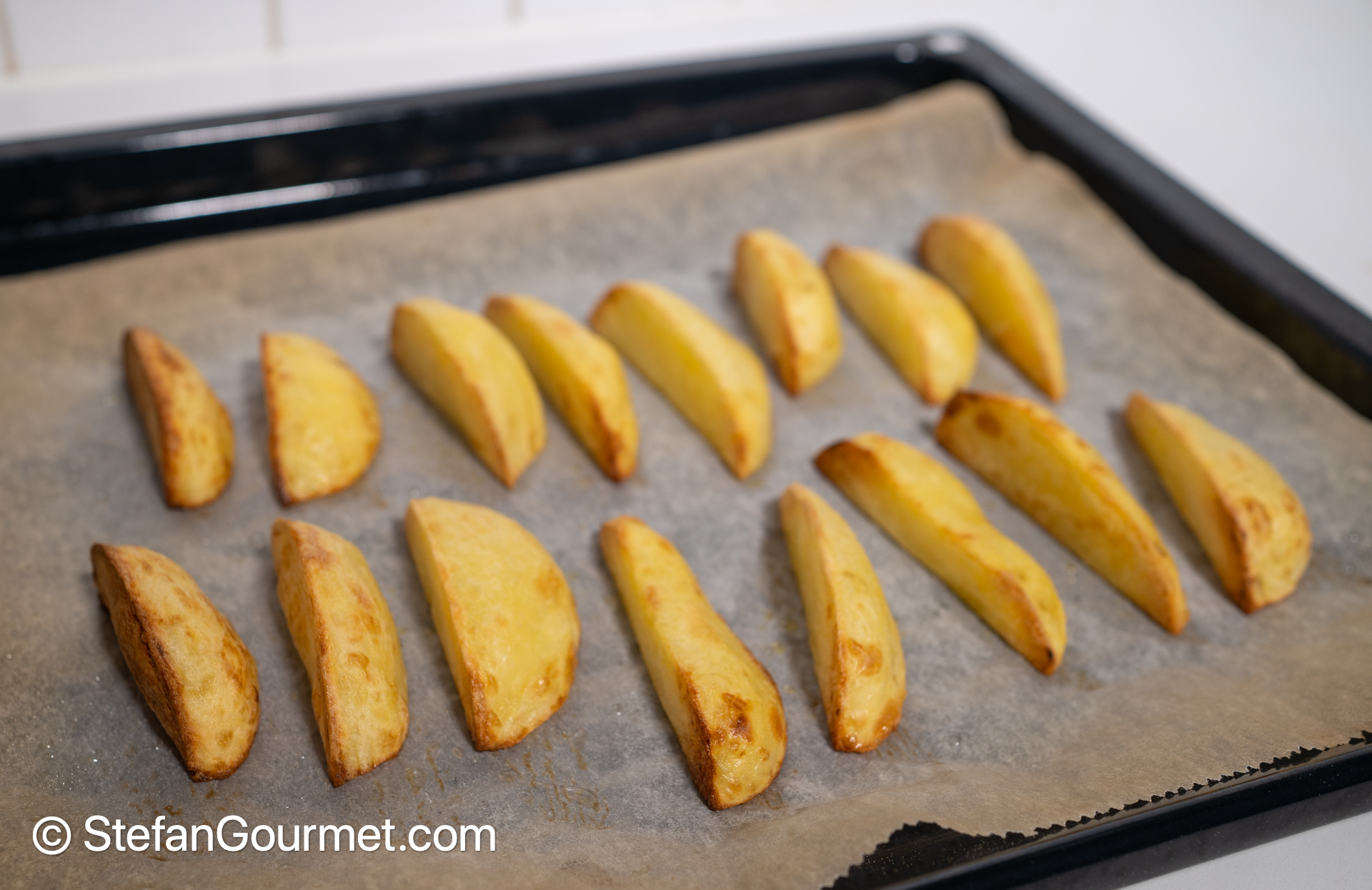 Continue baking the potatoes until they are golden brown and cooked through, about another 15 minutes.