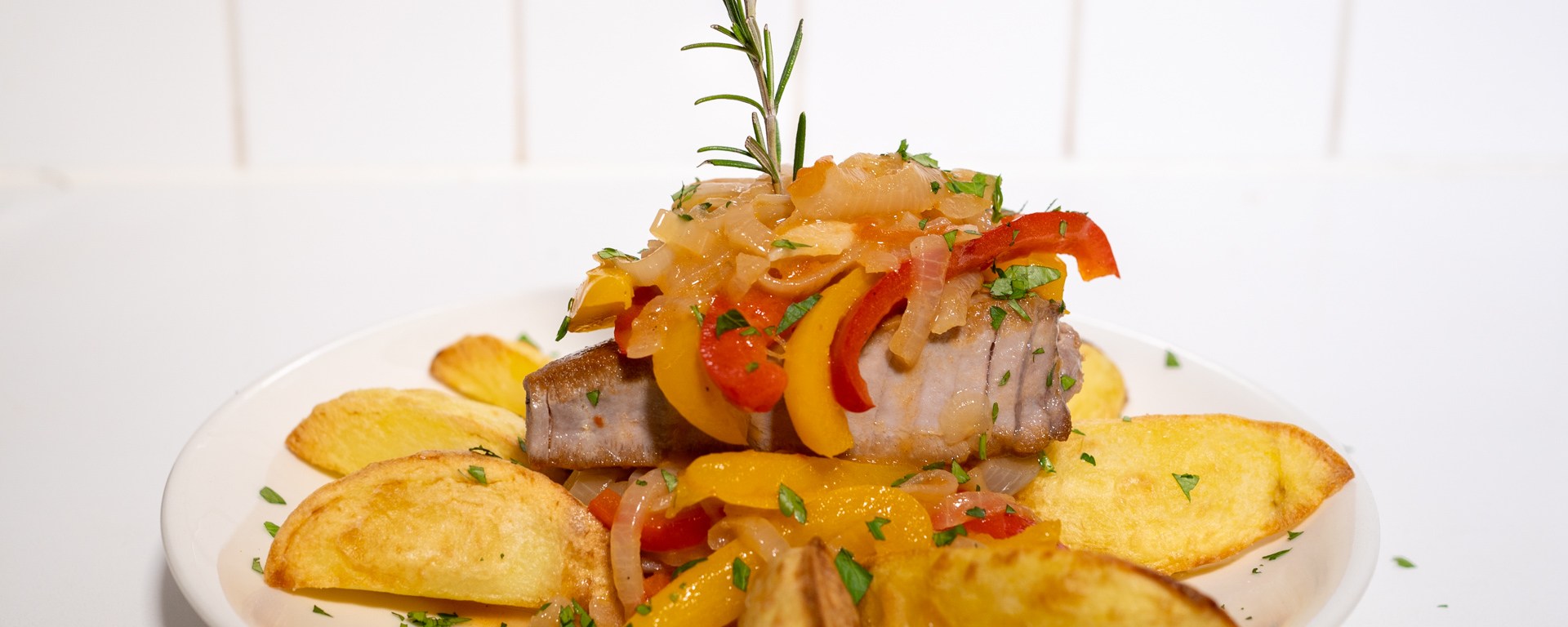 Arrange the tuna on top of the peppers and onions, and cover with the remaining peppers and onions. Garnish with parsley and more rosemary.