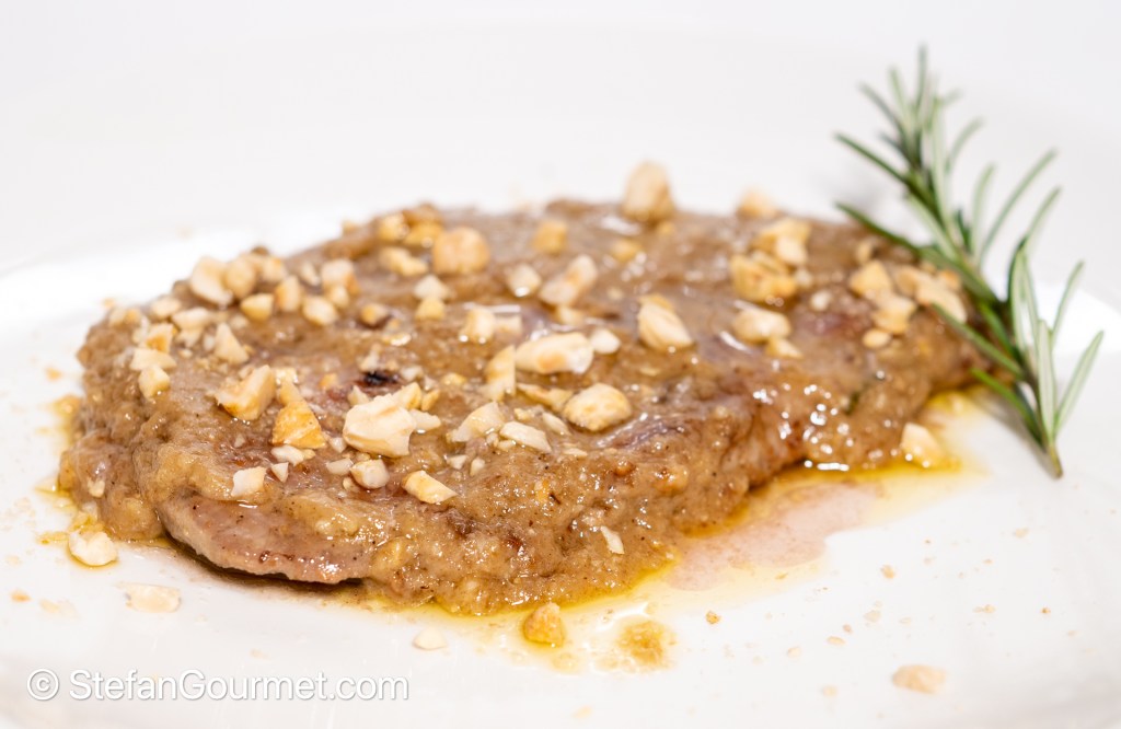 Thin slices of veal, referred to as scaloppine, are popular in Italian cuisine. They are tender but do not have a lot of flavor, and so they are usually served with some kind of sauce or topping. You often find many variations on restaurant menus such as saltimbocca (with prosciutto and sage), with marsala, with balsamic, or piccata. Paola of Primo Non Sprecare proposed a variation I had not seen before: scaloppine with hazelnuts. Finely ground hazelnuts are used to thicken and flavor the pan sauce, and coarsely chopped hazelnuts add texture. The main change that I made compared to her recipe is that I toasted the hazelnuts first to bring out their flavor.