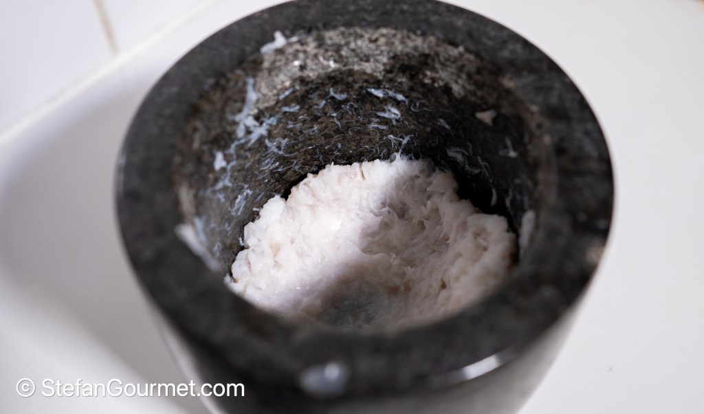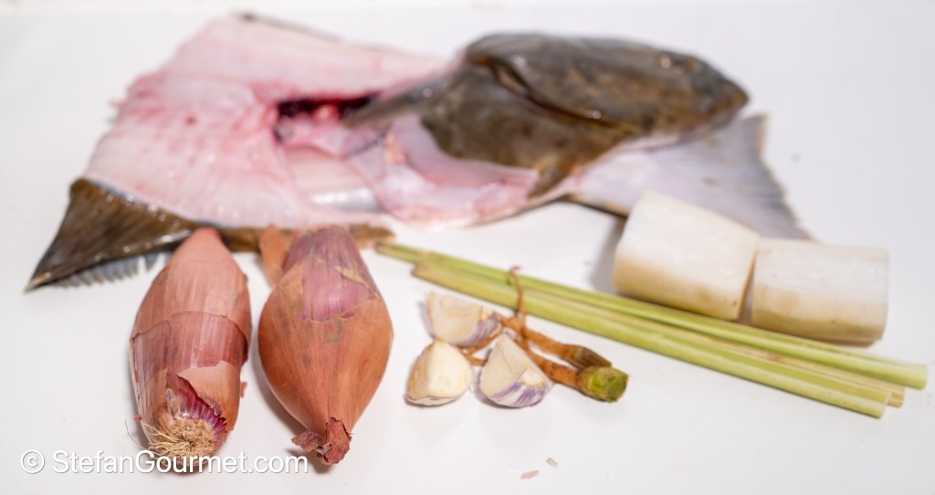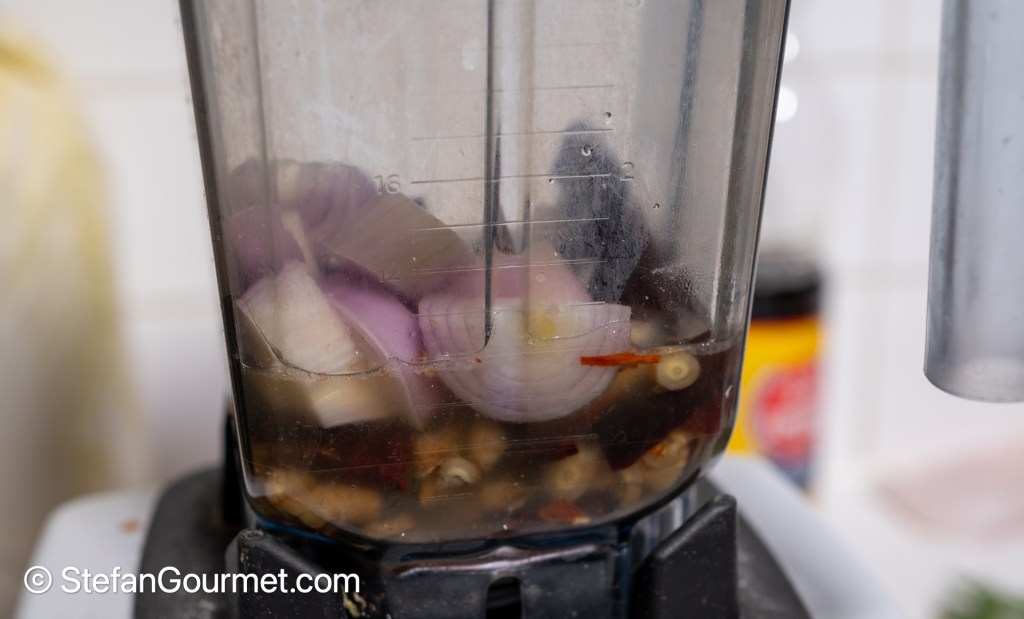 Remove the seeds from the dried chiles. Put the chiles in a blender together with the shallots, garlic, fingerroot, and shrimp paste. Cover with some of the fish stock.