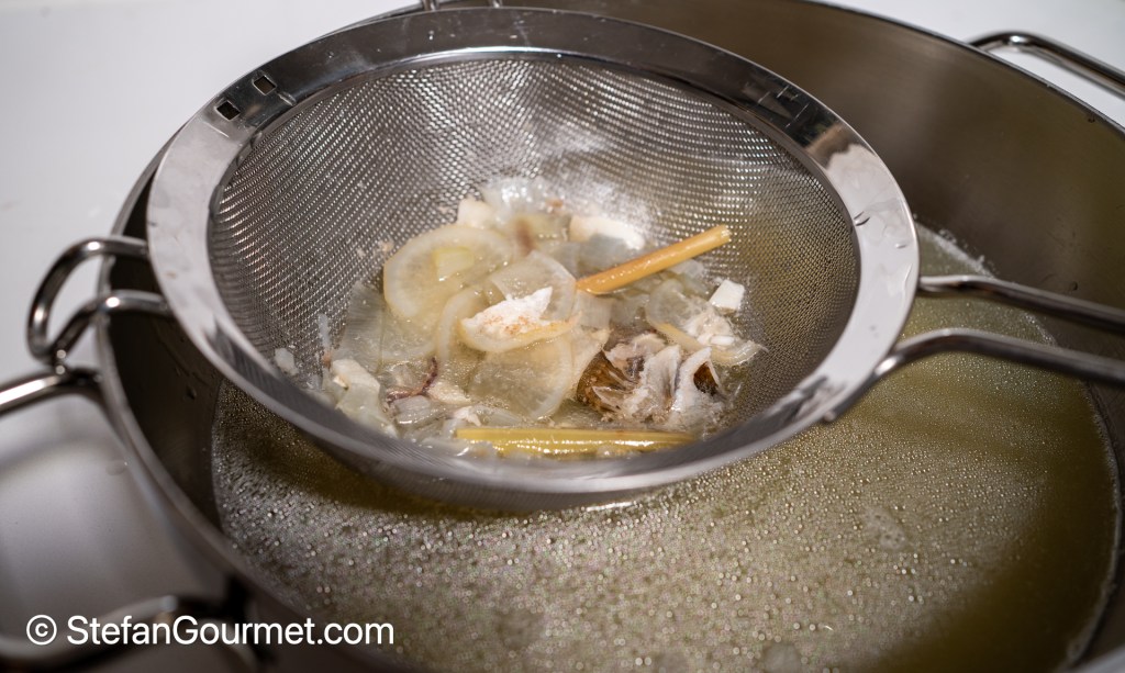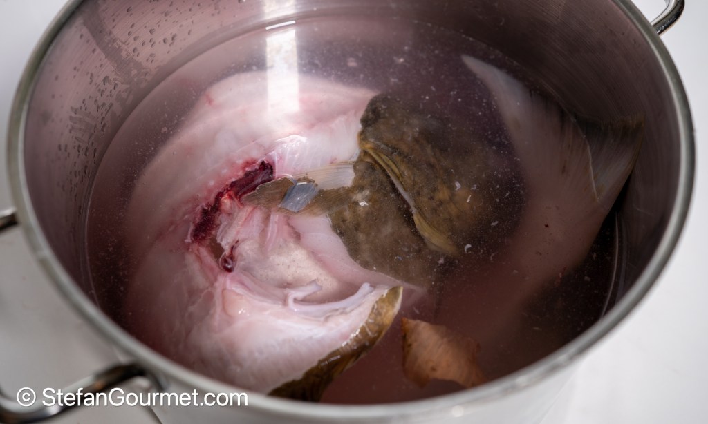 Put the cleaned fish heads and bones in a stockpot and cover with cold water (about 1 litre/4 cups). Bring to a boil, then remove the scum that will rise to the surface.