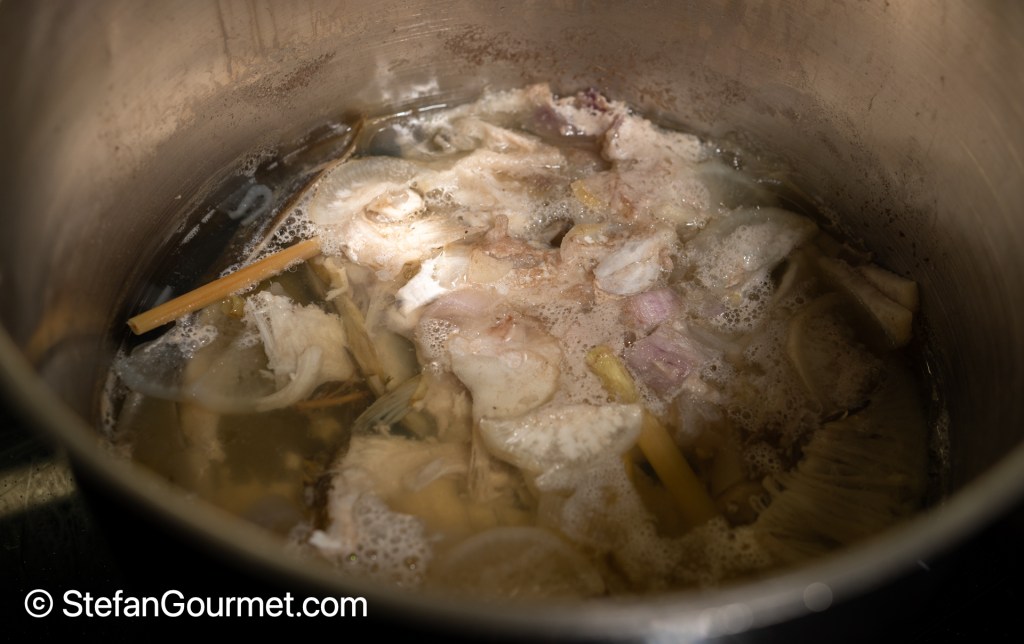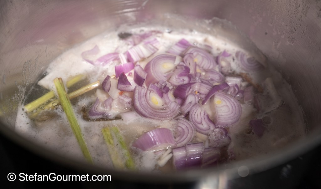 After removing the scum, add the lemongrass, shallots, cilantro roots, garlic, and daikon.
