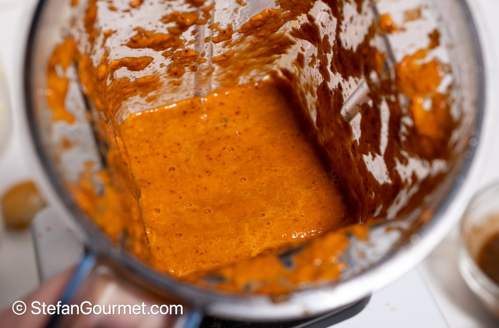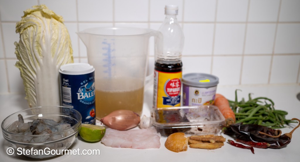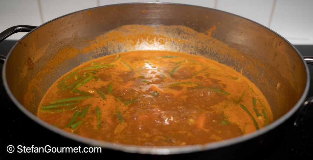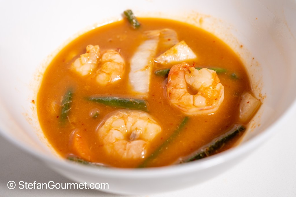Gaeng Som is a water-based Thai sour curry that can also be described as a spicy seafood and vegetable soup. Literally Gaeng means curry and Som means sour. The curry paste is easy to make from scratch, as it is allowed to add water to facilitate the blending process. It is a light dish, because it doesn’t contain coconut milk. I have mostly followed the recipe of Hot Thai Kitchen, but decided not to use green papaya as it is ridiculously expensive here and doesn’t have much flavor.