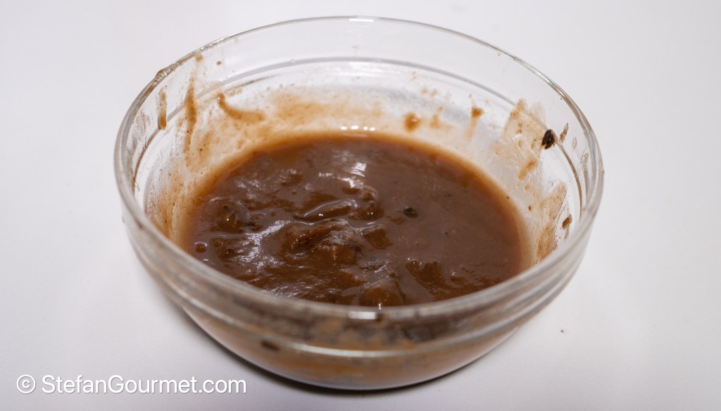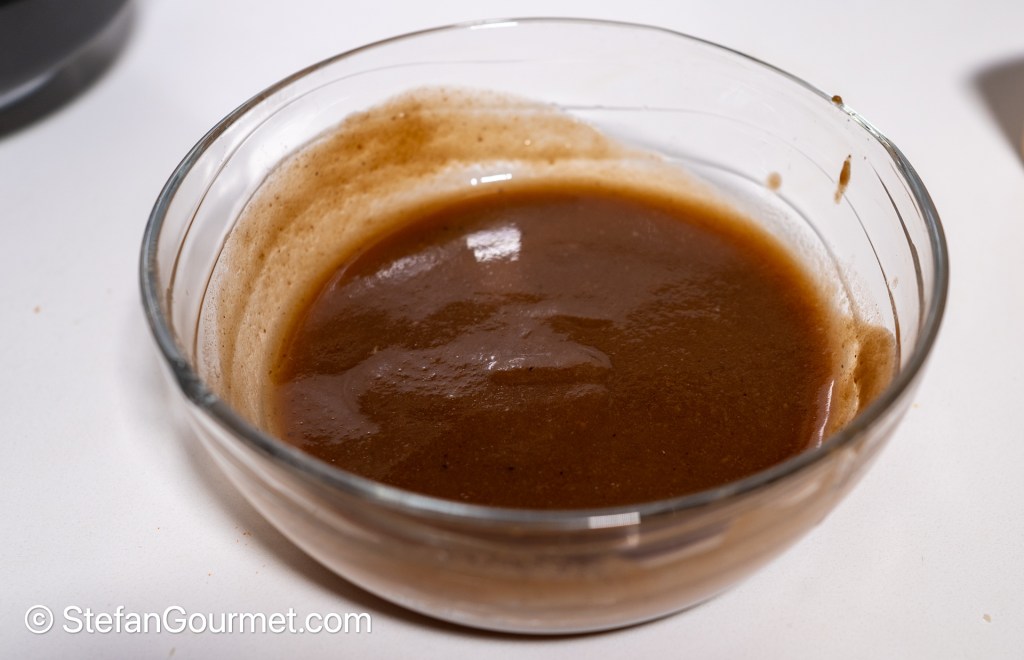Make tamarind juice by covering tamarind pulp with hot water and letting it soak for 15 minutes. After that, squeeze the tamarind pulp with your hands to get the juice out.