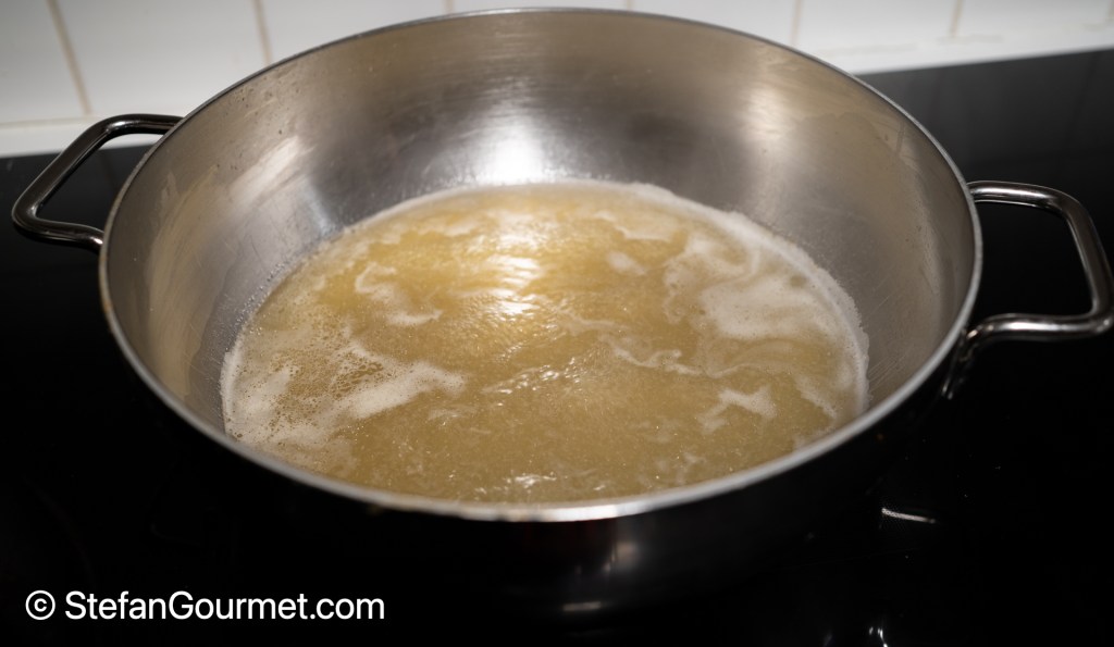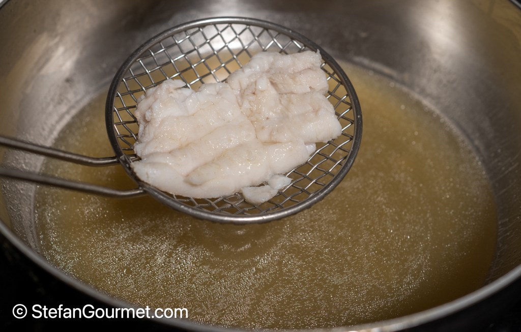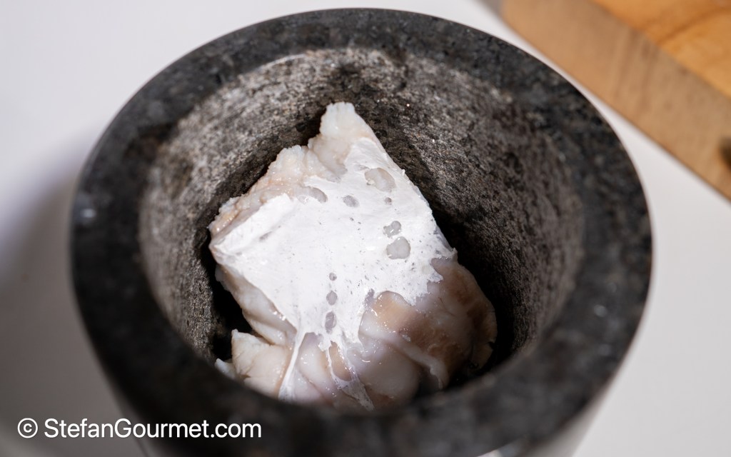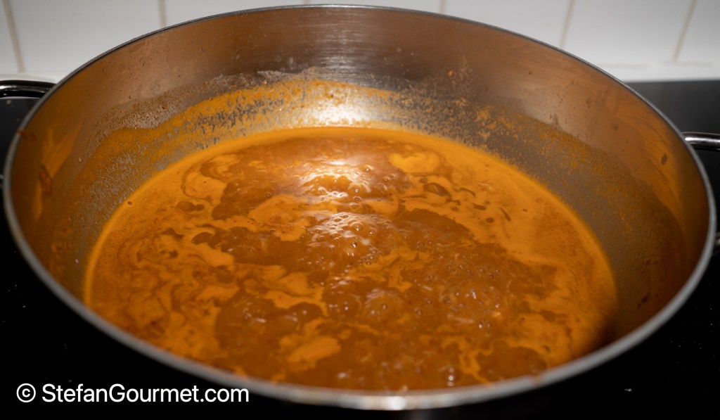 Put this fish puree in the stock, and stir to ‘dissolve’ the fish in the stock.