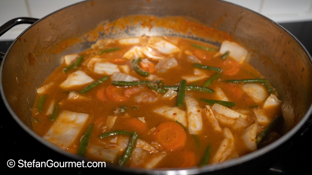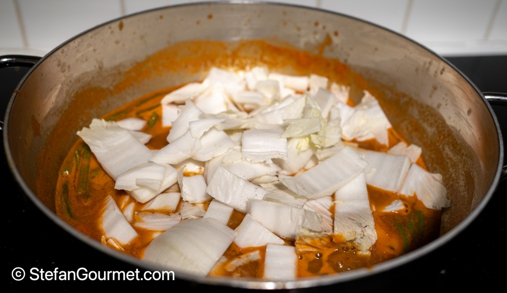 Then add the napa cabbage, and boil for about 3 more minutes or until all the vegetables are tender but still firm to the bite.