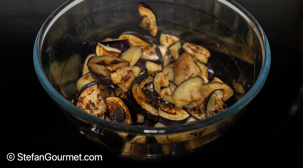 The eggplant doesn’t need to be completely cooked, as it will be cooked some more in the next step.