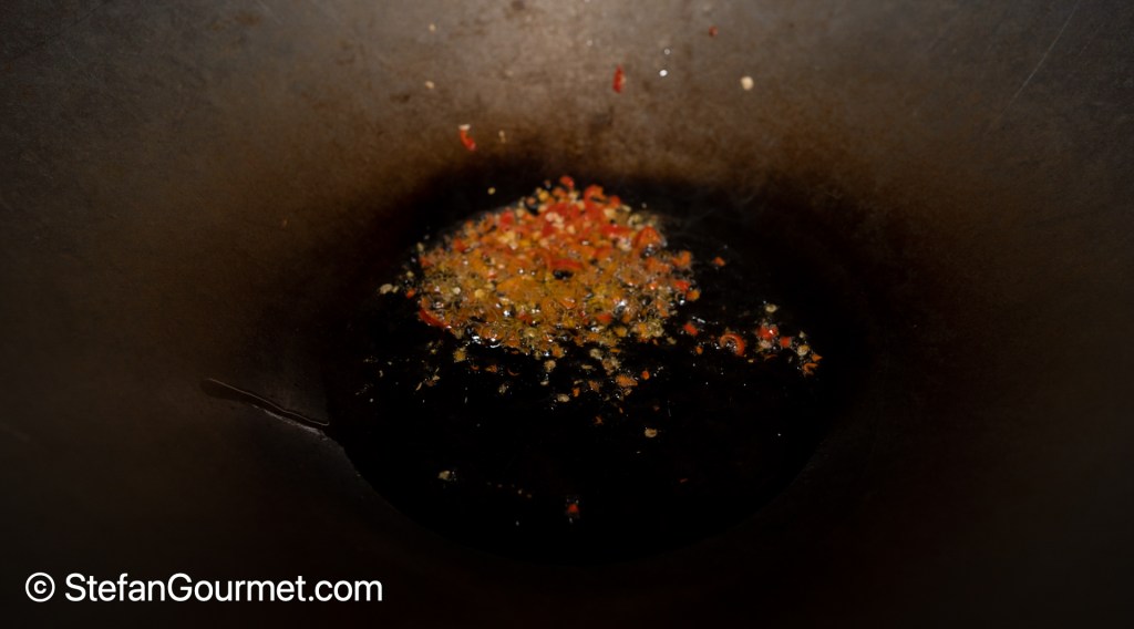 Heat up a wok and add a tablespoon of oil. Then add the minced chillies and stir for a minute.