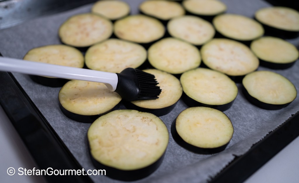 My preferred method, probably not a very Thai thing to do, is to preheat the oven to 225C/440F, to arrange the eggplant slices on a baking sheet lined with oven paper, and to brush them lightly with oil.