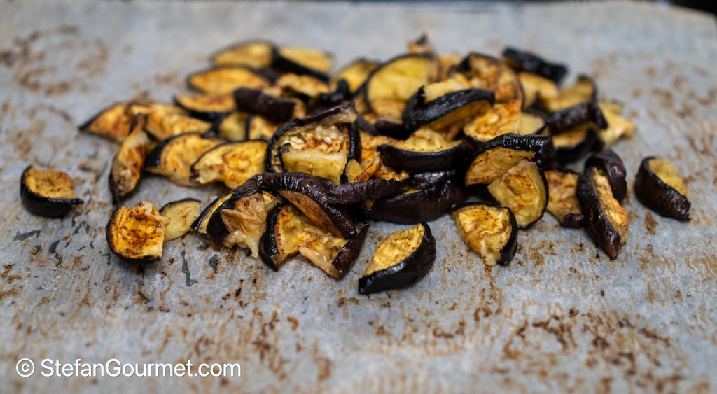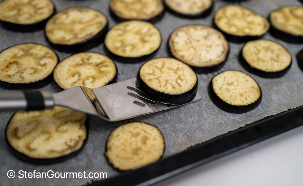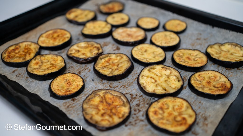Roast the eggplant for 15 minutes at 225C/440F, then turn the slices…