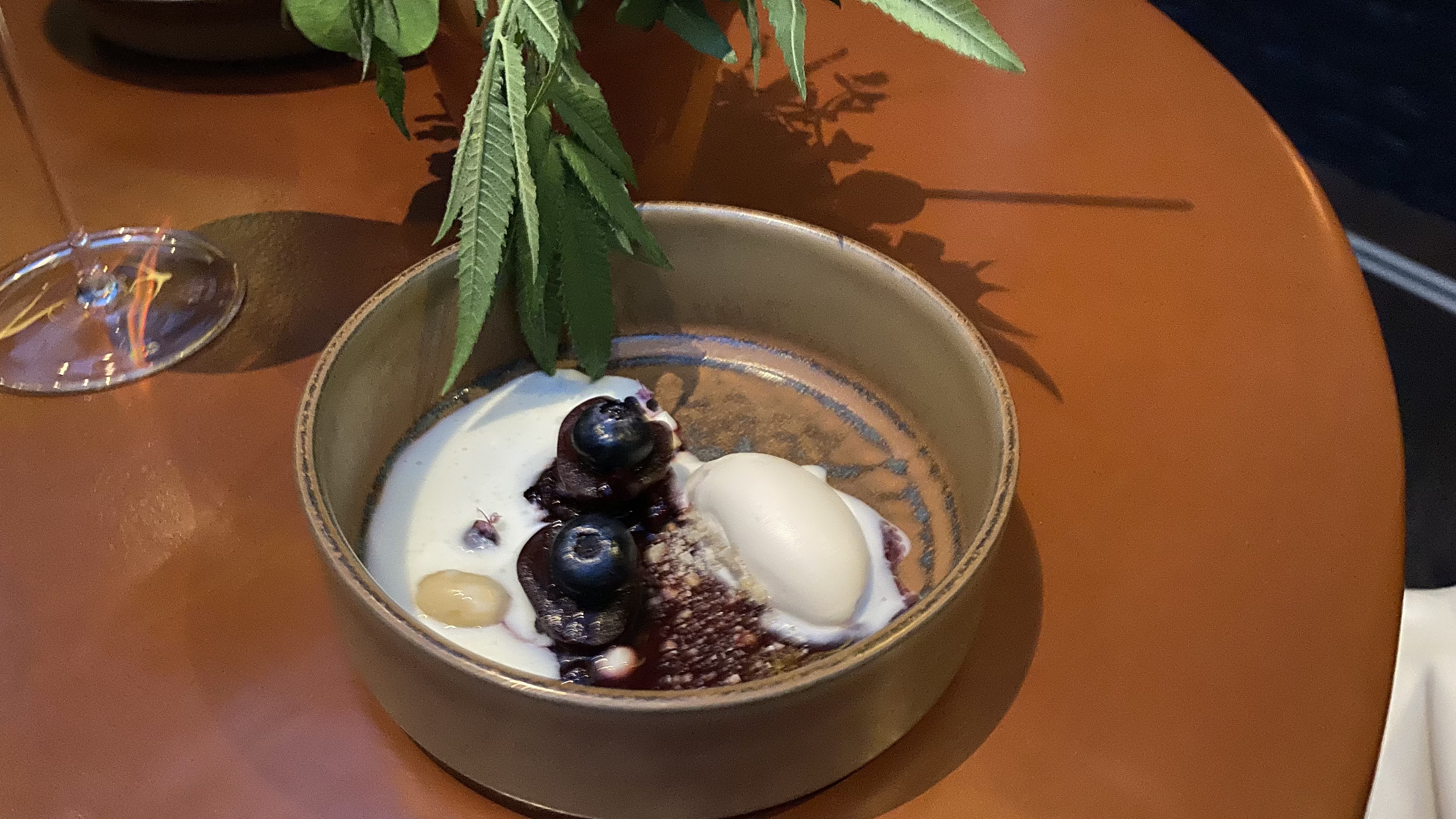 A T-bone of duck with a creamy fermented bell pepper sauce and unripe strawberry. This was nice, although not as nice as the duck T-bone with orange and chocolate from 2018. 9/10