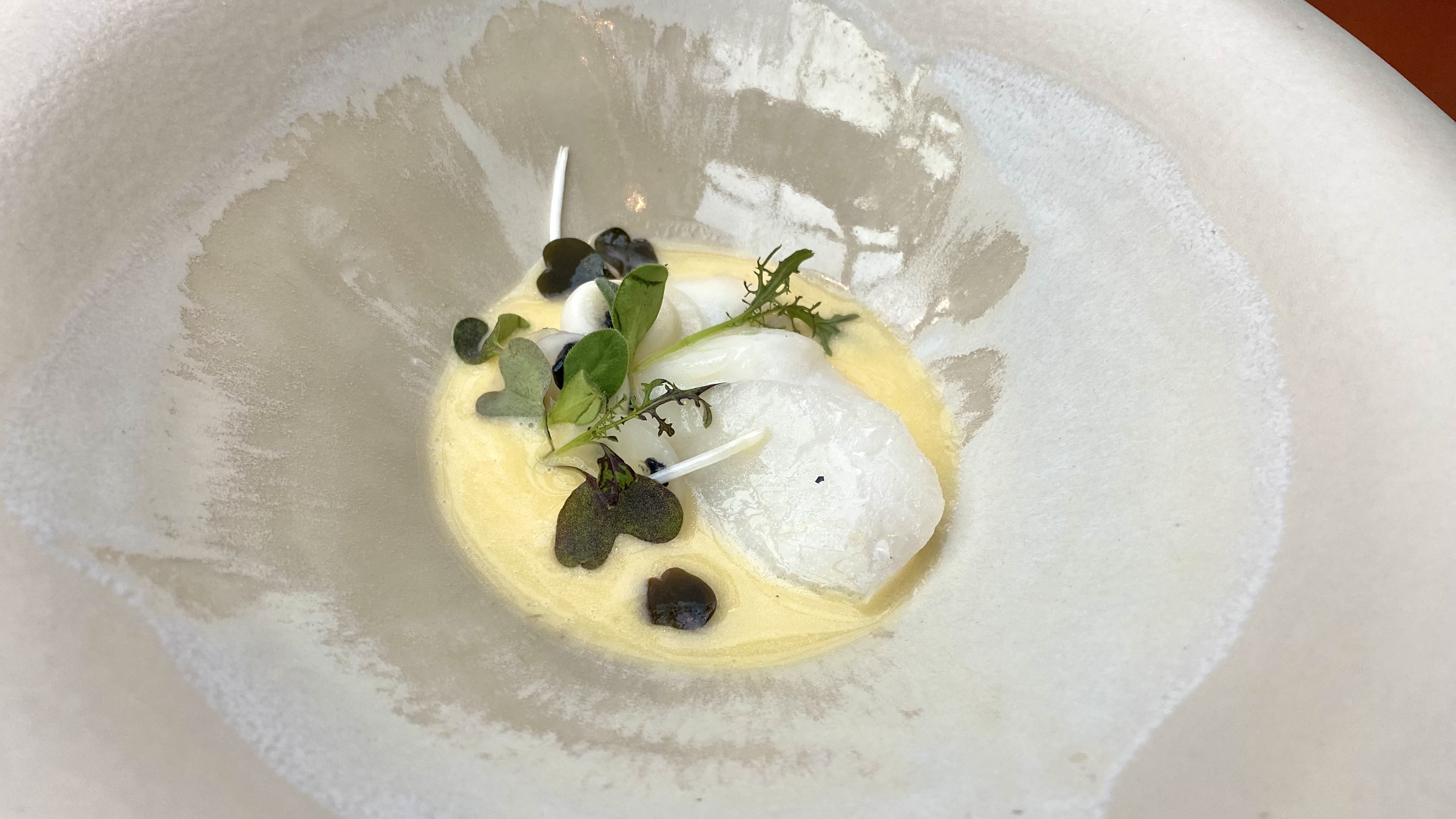 Chef Jonnie Boer has been serving scampi (langoustine) ceviche with homemade kombucha as the acid for a long time, and this time the kombucha was made from verveine. This dish was quite spicy and worked very well with the same Riesling, but also with a Txakoli from the Bask Country. A regular Txakoli would have been too acidic for the spiciness of this dish, but this was was aged on the lees and worked beautifully. It was hard to decide which was the better pairing. On the one hand the dish brought out the complexity of the Riesling, but on the other hand the Txakoli worked slightly better with the spiciness. 10/10