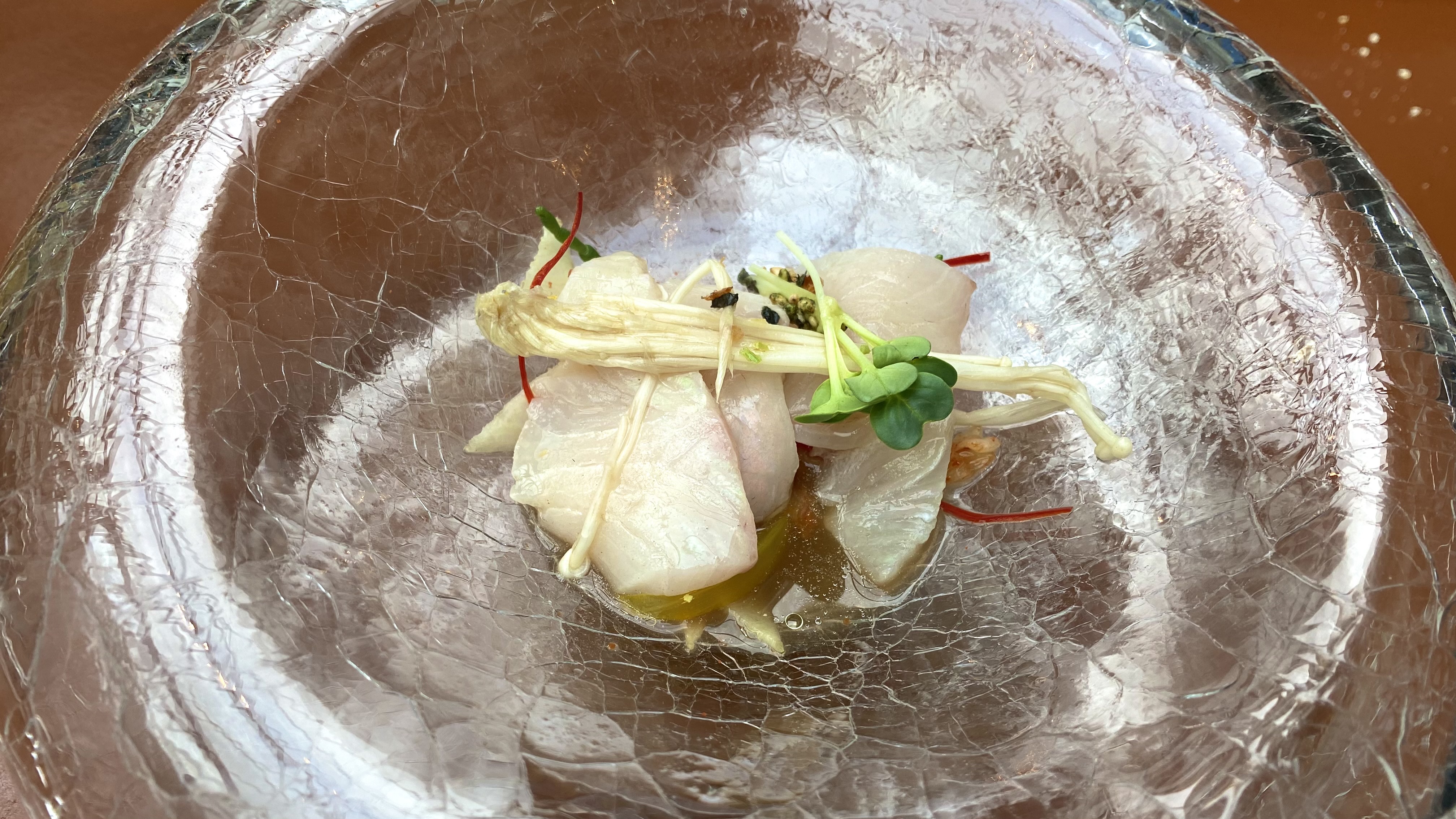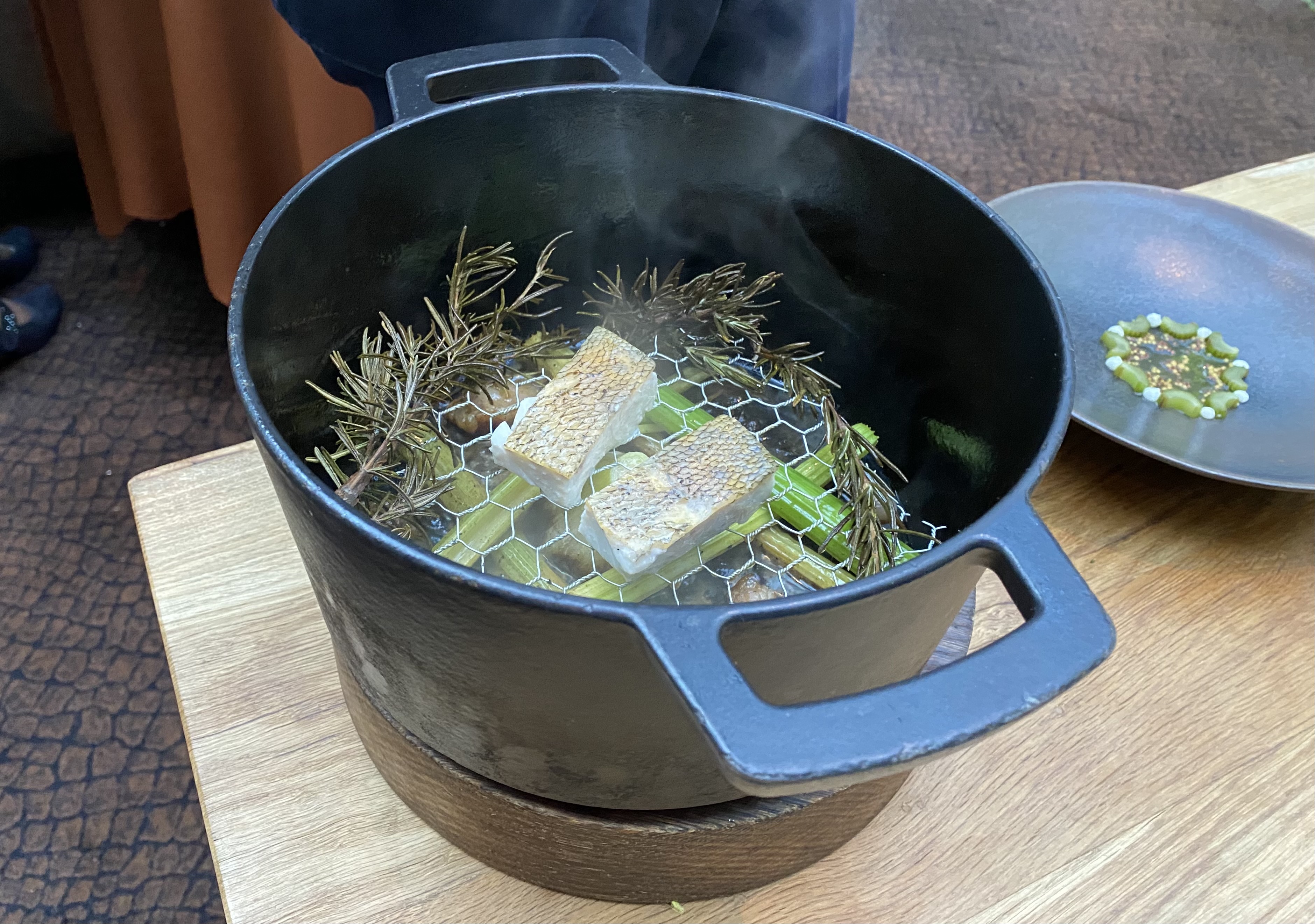 Yellowtail shabu shabu, with the yellowtail cooked tableside in mushroom stock. A very elegant dish, paired perfectly with a Chardonnay from the Upper Hemel en Aarde Valley in South Africa. 10/10