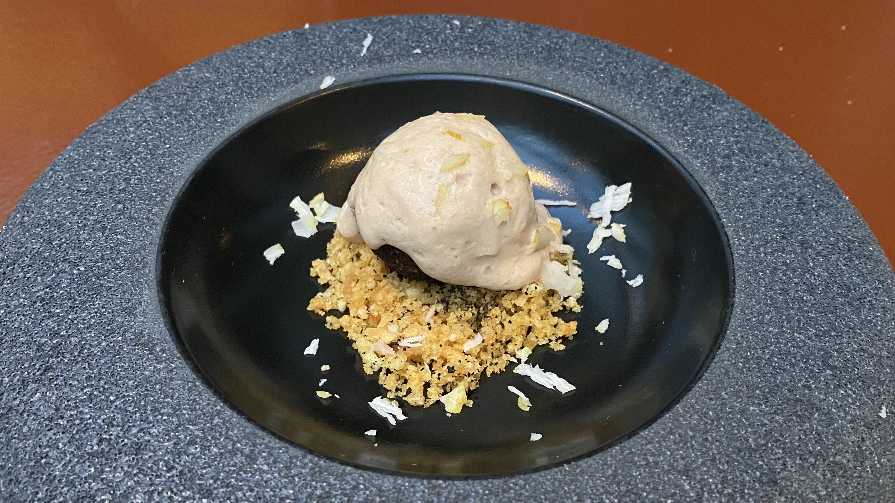 Confit of young cod loin with black garlic and a butter sauce (made from the same butter). The flakes of cod were perfectly cooked in the butter, very tender and juicy. That is quite a feat for cod. This was paired perfectly with a 2014 Chenin Blanc from New Zealand, that was very nicely aged and reminiscent of a Vouvray (also Chenin Blanc, but from the Loire Valley). 10/10