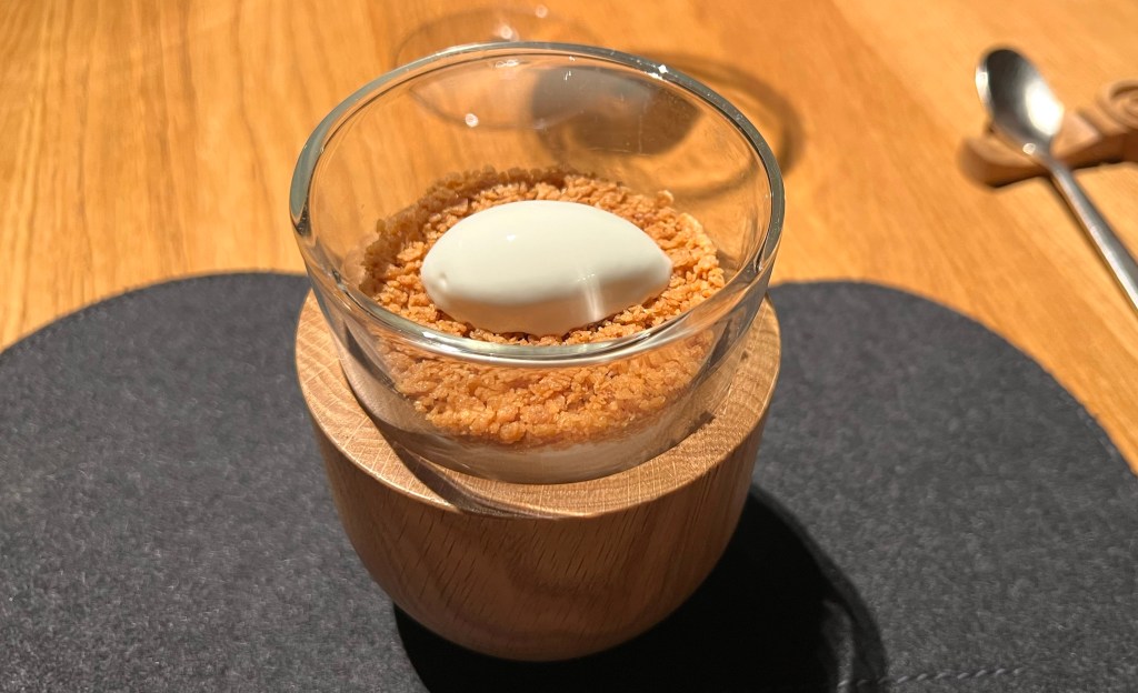 The first dish of the menu was the most famous signature dish of the chef: Grana Padano ‘hot and cold’ with caramellized onion. This dish is all about contrast between hot and cold, crispy and soft, sweet and salty. It includes grana ice cream, grana crumble, and of course caramelized onion. 10/10!