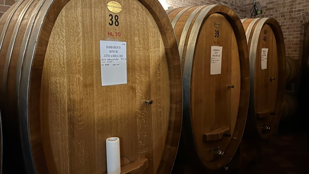 Our next visit was to Albino Rocca, a family-owned smaller winery with vineyards in the MGAs of Cottà (Neive), Ronchi (Barbaresco), Montersino (San Rocco) that produces Barbaresco in a traditional style. Cottà and Ronchi are located next to each other, but with a different exposure: south-west for Cottà and south-east for Ronchi, with older vines. Montersino has the highest altitude in Barbaresco and used to be planted with Dolcetto and Moscato, but due to climate change this may actually become the best terroir for Nebbiolo.