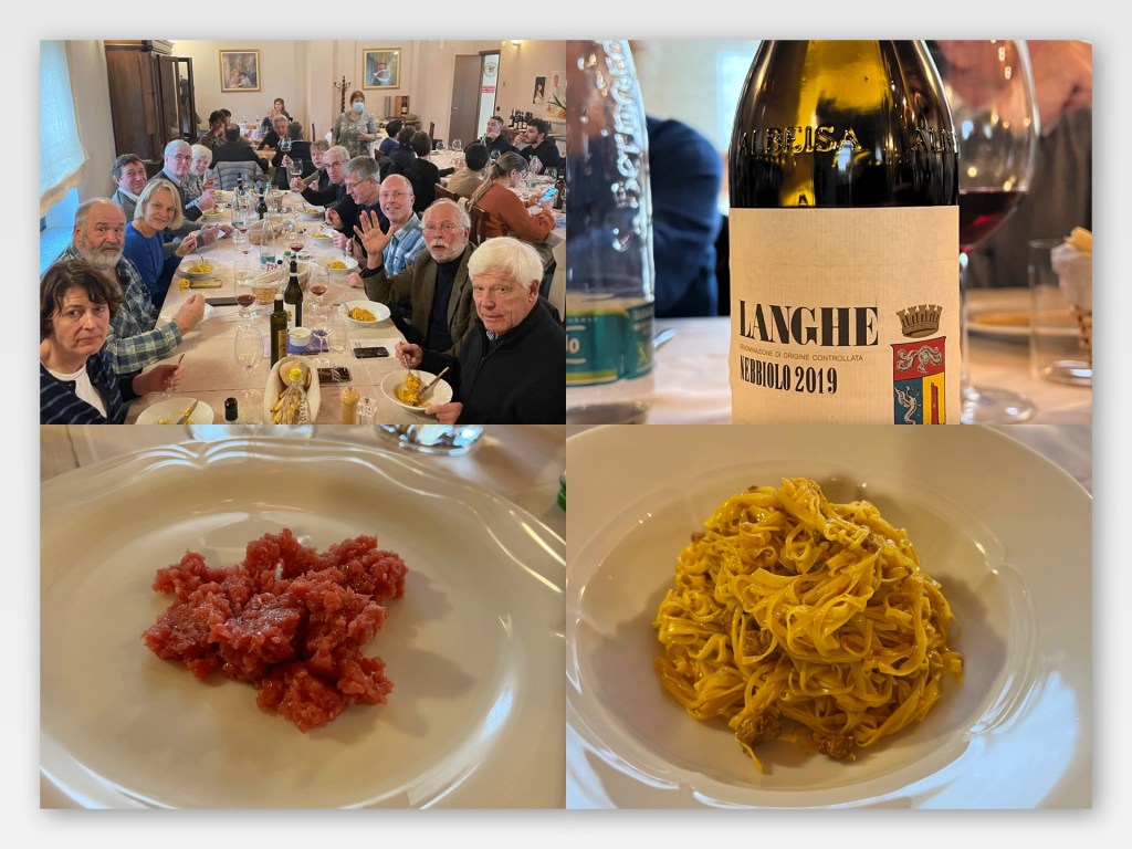 We had lunch at Antica Torre, next to the tower. With lunch we had Langhe Nebbiolo 2019 from the Produttori di Barbaresco, which we were going to visit right after lunch. This Langhe Nebbiolo is actually produced in the production area of Barbaresco, but it is declassified by the Produttori, for example because it is made from younger vines. For lunch we had carne cruda (which is simply ground beef, dressed with extra virgin olive oil, salt, and pepper, a very traditional Piemontese dish), and tajarin al ragù di carne (a ragù “in bianco”, without tomato).