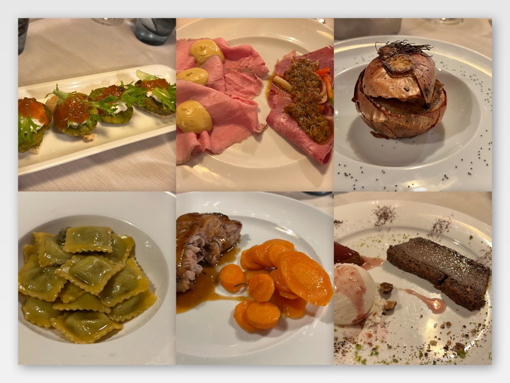 We had dinner at Osteria Tastè, which was probably the best food of the trip. After some nice crostini the antipasti were veal tongue with sweet and sour vegetables, as well as vitello tonnato. Then a baked onion, filled with a mixture of bechamel, sausage, and amaretti. A very original and delicious dish that I will definitely try to replicate soon and share with you on this blog. Followed by oxtail ravioli with sugo d’arrosto, kid goat with carrots, bonet, pear ice cream, and poached pear.