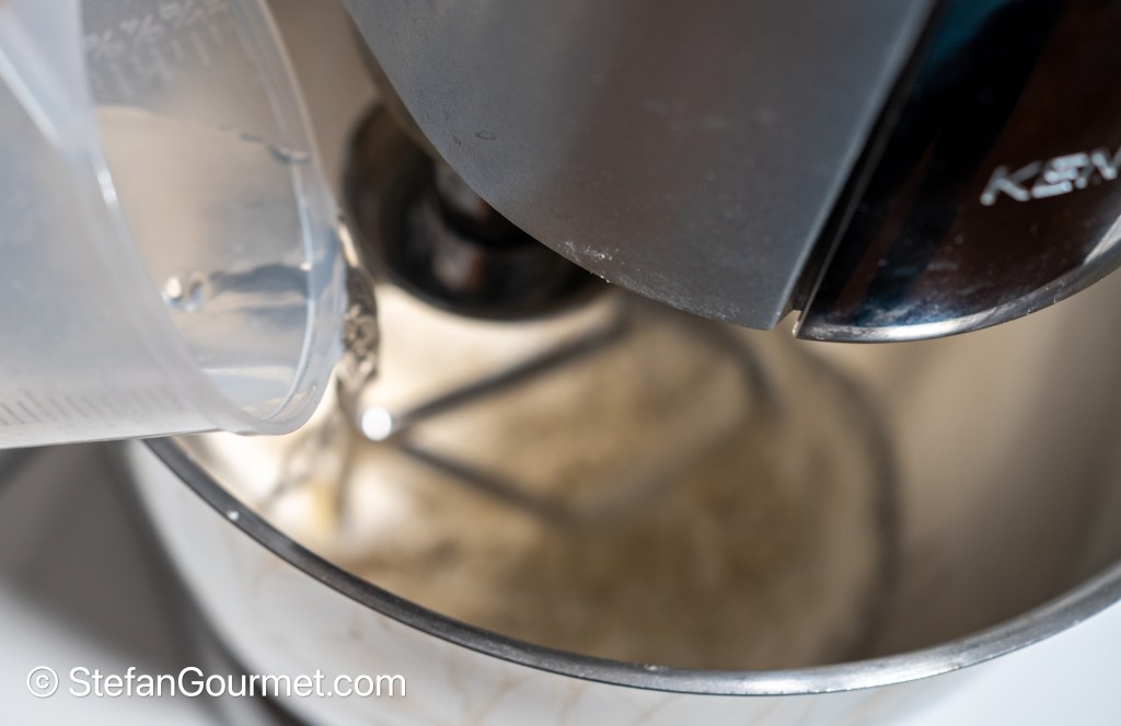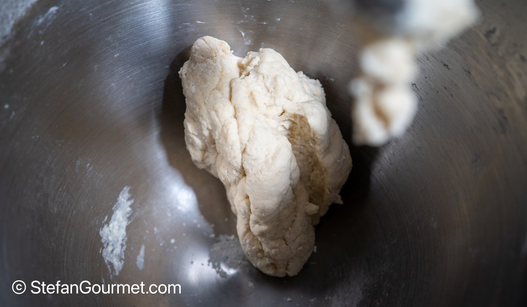 When the dough has come together (you can help a bit with your hands; it is fine if it stays together after you’ve helped it, but add more water if it won’t come together)…