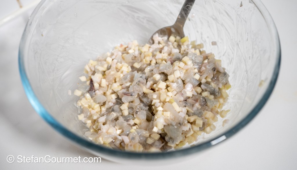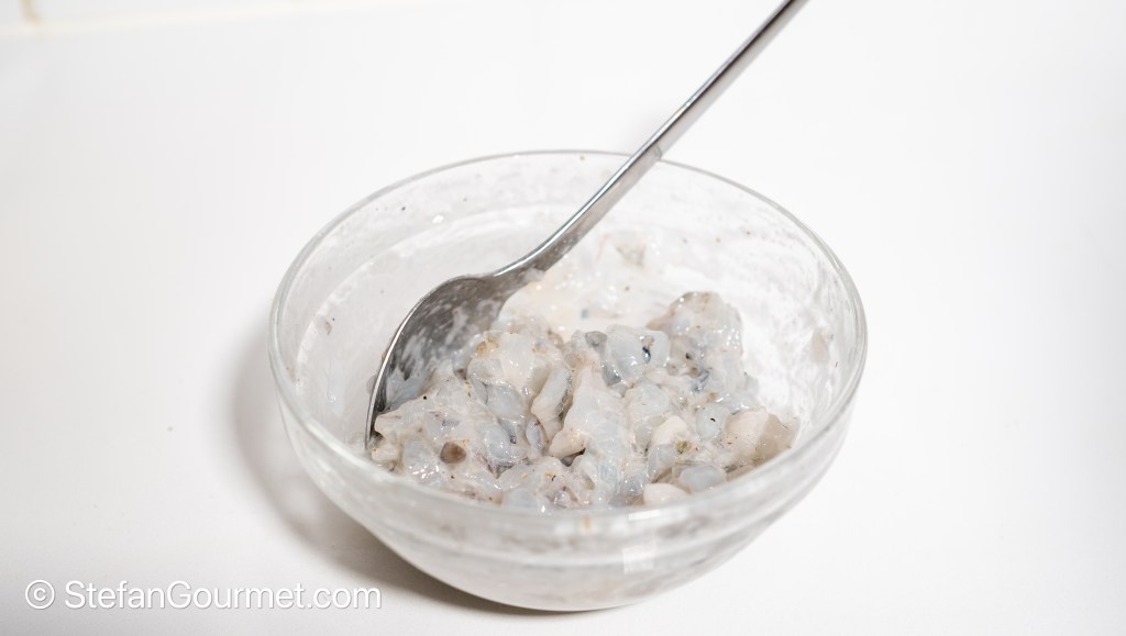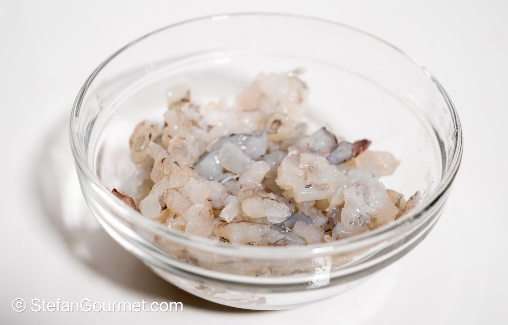 Mince the shrimp coarsely. On Chinese Cooking Demystified the shrimp is salted and then rinsed for a long time with cold water. This may be necessary with fresh shrimp to remove any slime, but I had to use frozen shrimp as fresh shrimp is not available here.
