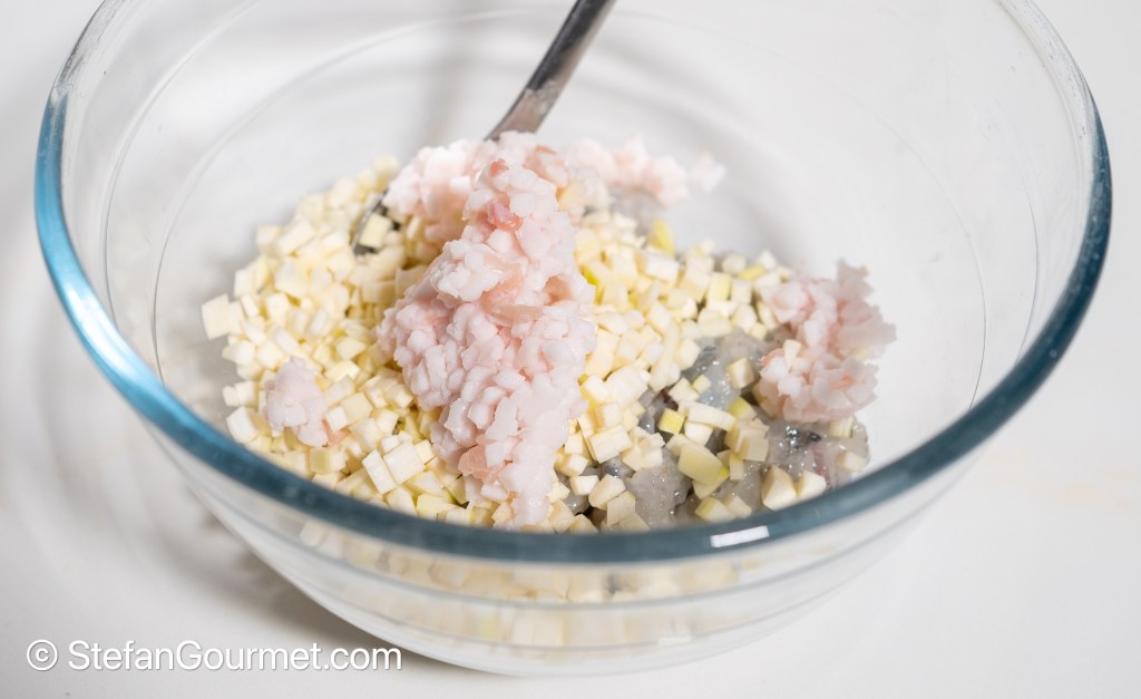 Add the minced pork fat, minced water bamboo, and lard to the shrimp…