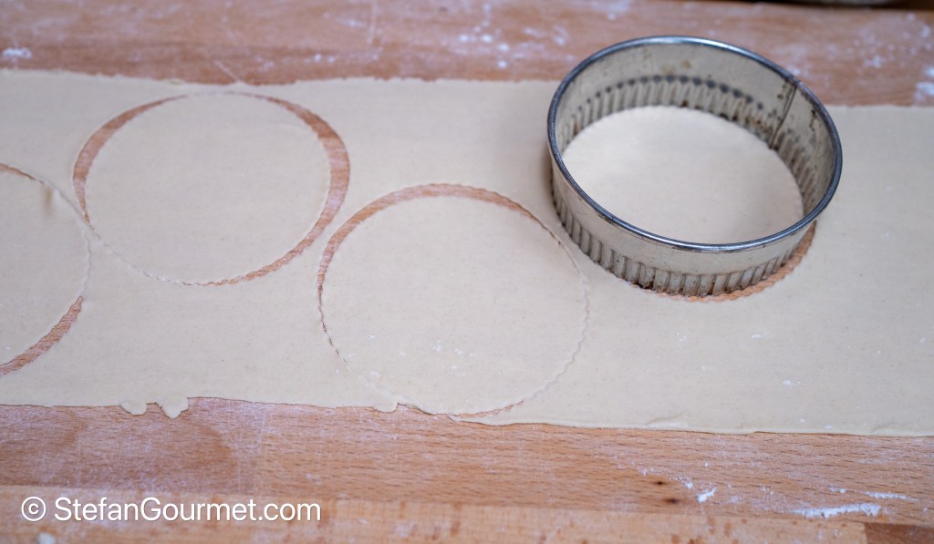 Roll out the dough very thinly, using the same procedure as when making ravioli. Cut out circles with a diameter of 10 cm (4 inches).