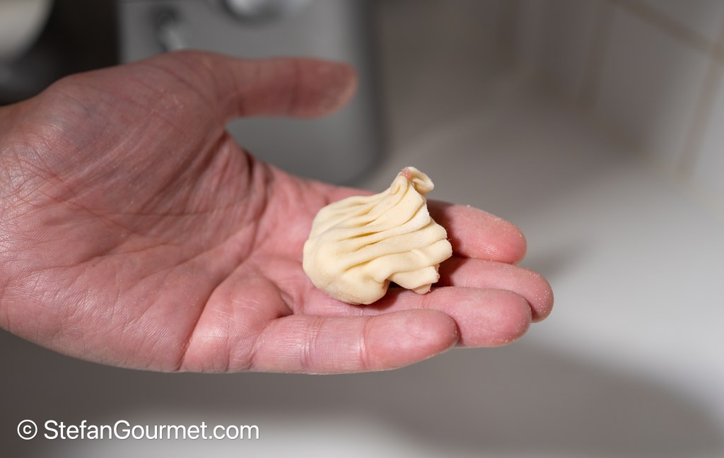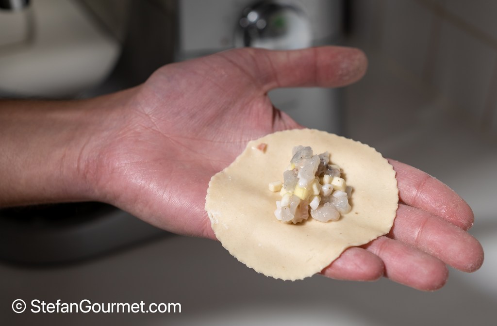 1. When I tried it, the wrappers would tear far too easily. I don’t know if it is a matter of more or less water, more kneading, more resting, or whatever. Using regular wrappers is a nice solution I think, because the fillling is outstanding.