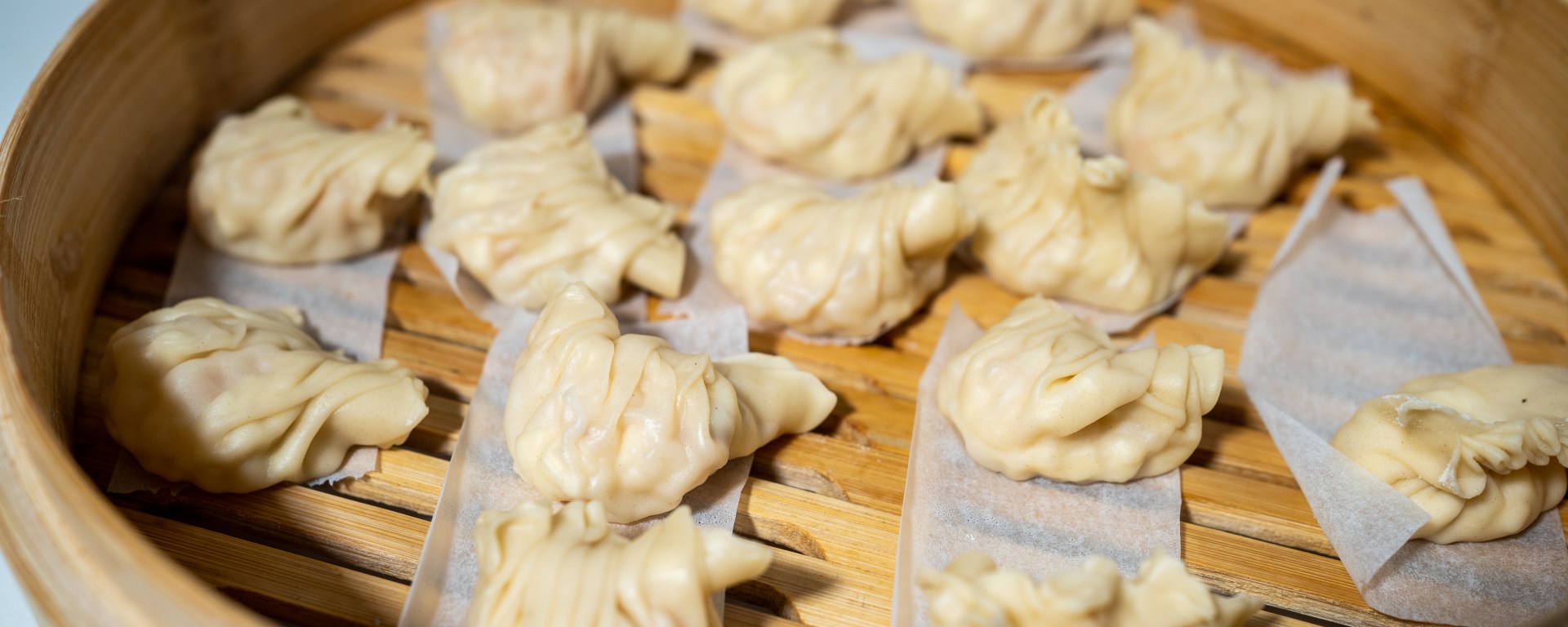 Place the dumplings in a bamboo steaming basket lined with something to prevent them from sticking but with enough holes for the steam to get through. We used perforated oven paper, but you could also place the dumplings on thin slices of carrot.