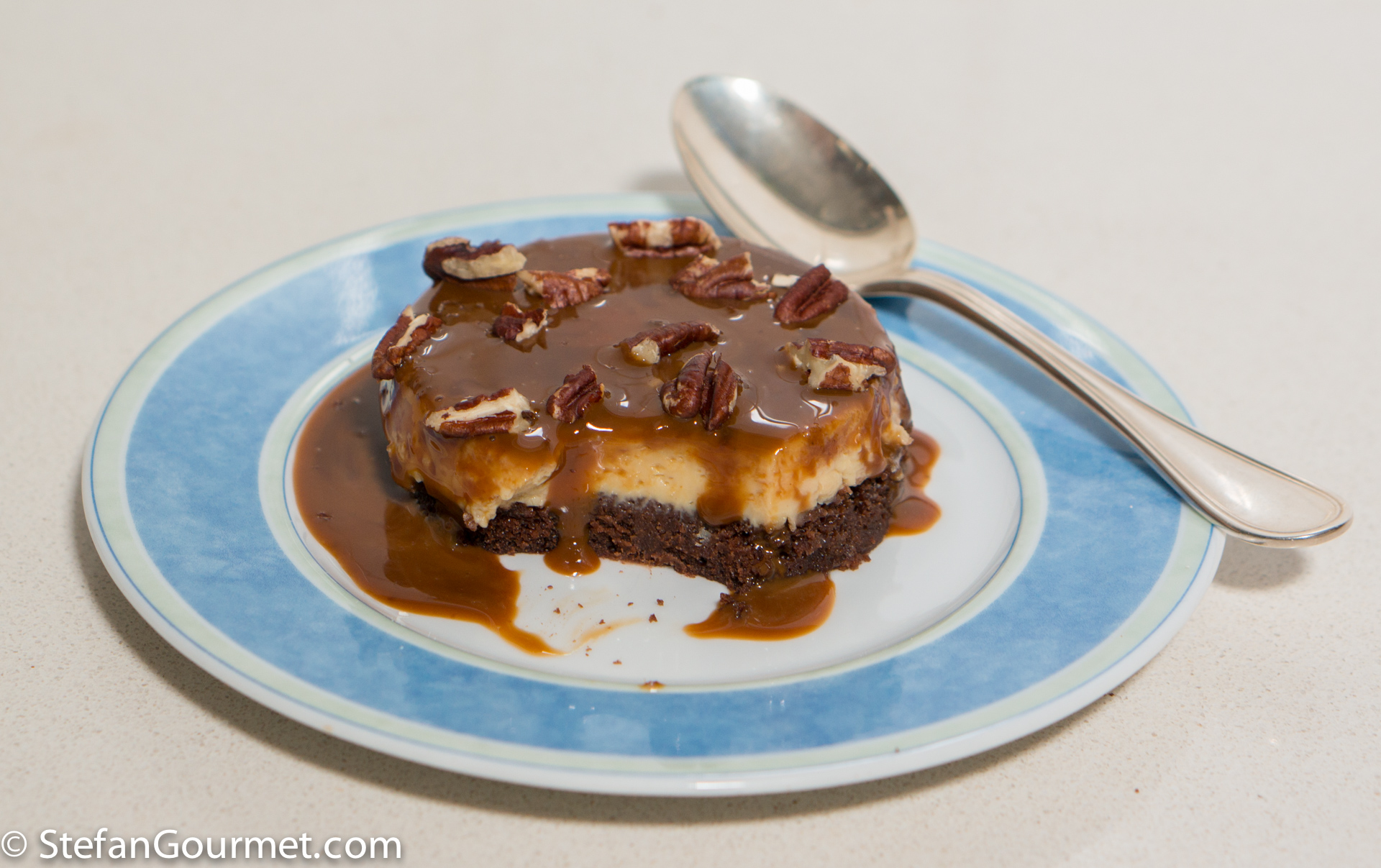 This Mexican dessert of vanilla and chocolate flan with dulce de leche and toasted pecans is absolutely delicious.