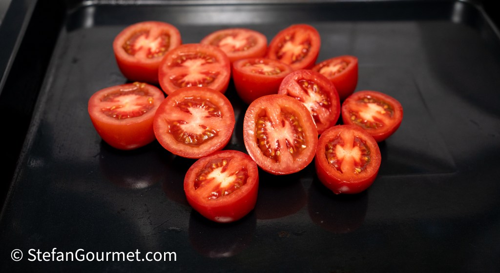 Preheat the broiler. Cut the tomatoes in half, and arrange them on a baking sheet.