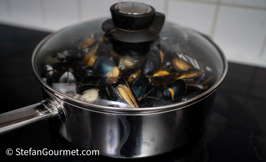 Cover and cook over high heat until the mussels have opened. Do not cook longer than necessary to avoid toughening the mussels.