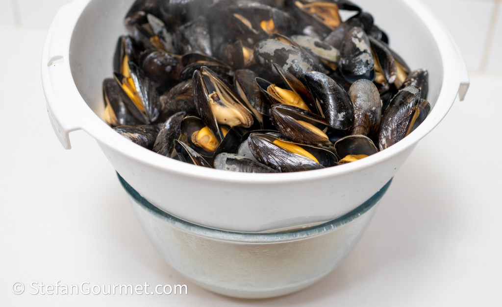 Drain the mussels, reserving the liquid.