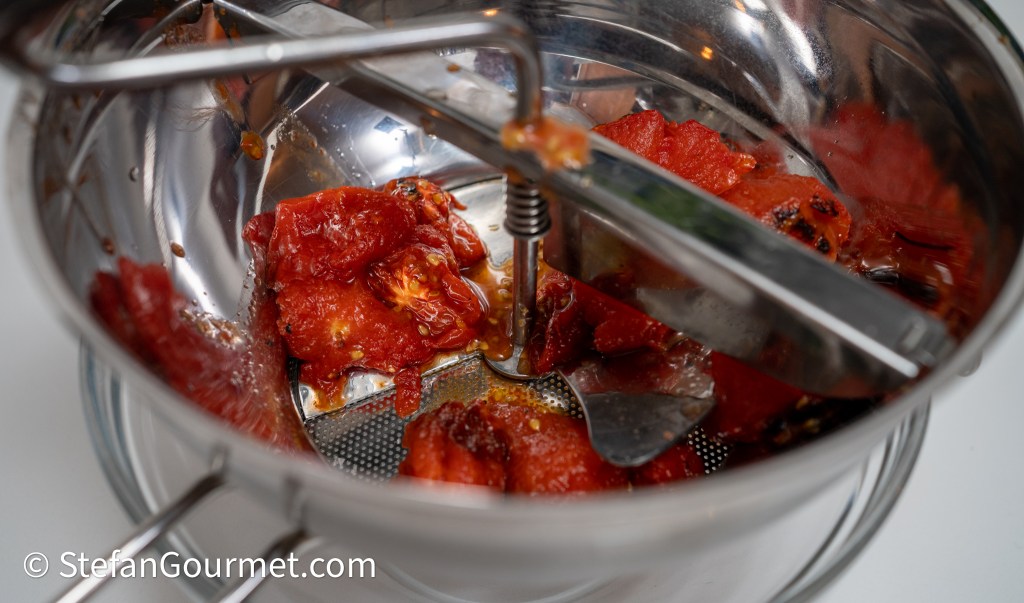 Sieve the roasted tomatoes using a food mill.