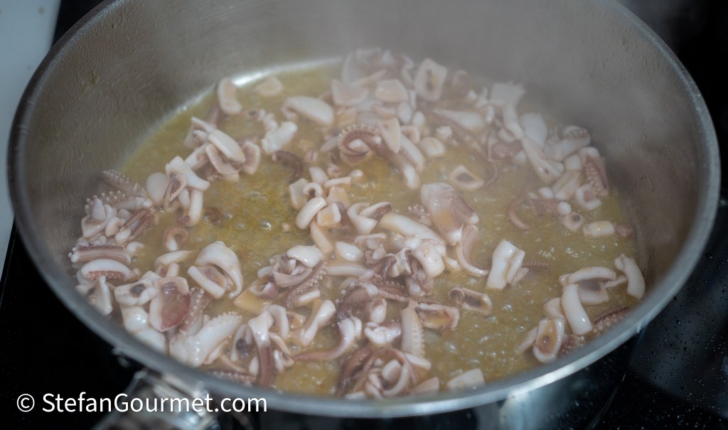 Cook the chopped squid very quickly over high heat in the garlic-infused olive oil, then turn off the heat and transfer the squid to a plate using a slotted spoon.