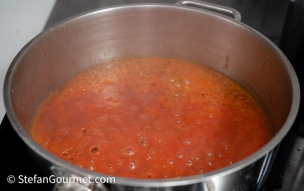 Add the sieved tomatoes to the olive oil and squid juices. Do not add salt, as the mussel liquid will provide all the salt needed for the ragù. Bring to a boil, then reduce the heat and boil gently until reduced by half.