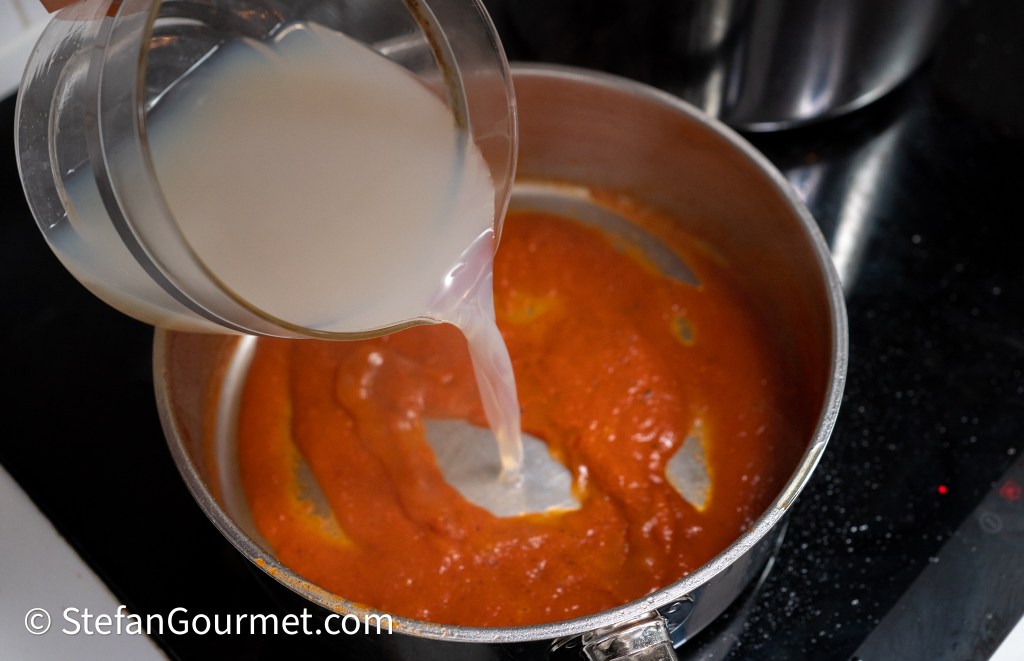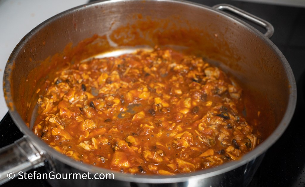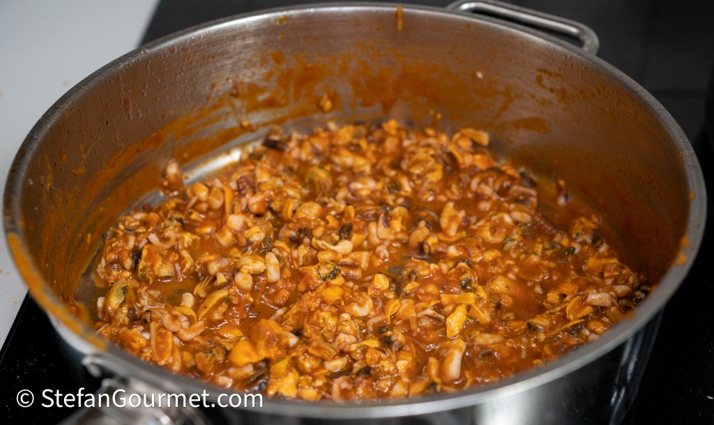 Simmer until the tomato sauce is nice and thick. Taste and add more mussel liquid (and reduce it again) until the sauce is salty enough. Season to taste with freshly ground black pepper.