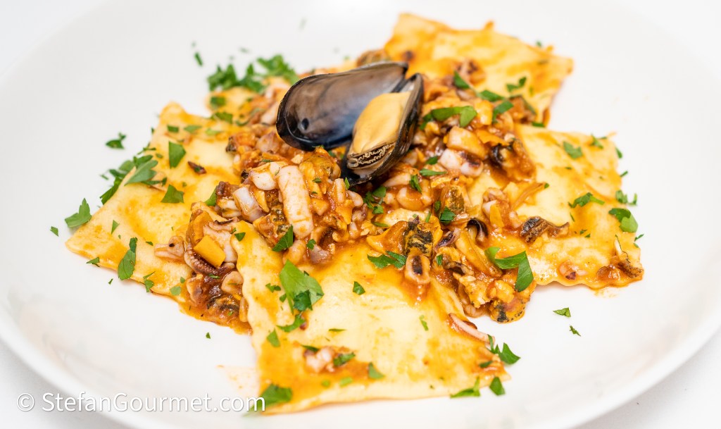 I find this hugely interesting ! I have made ravioli or similar surrounded by ragu before . . . but methinks not a seafood one. I do understand the reason for chopping the seafood but do not remember ever cutting up mussels or making squid so small . . . yes, that would hardly take any time cooking . . . as the Brits say ‘in for a penny, in for a pound’ . . . yours looks great, so shall try !!