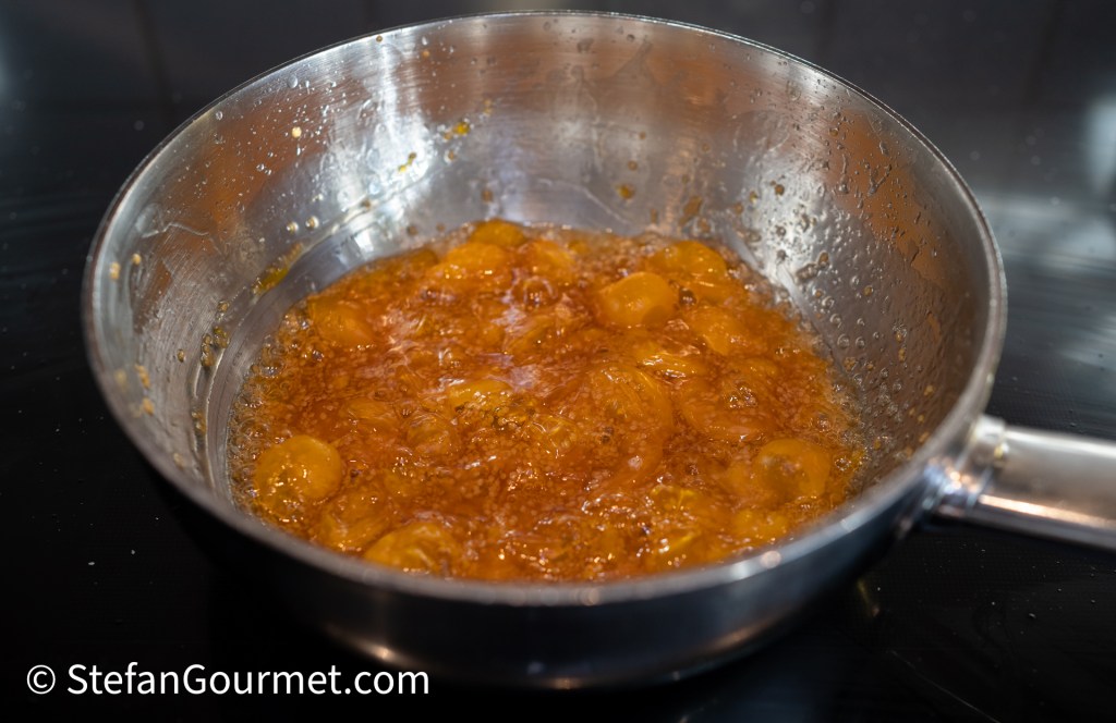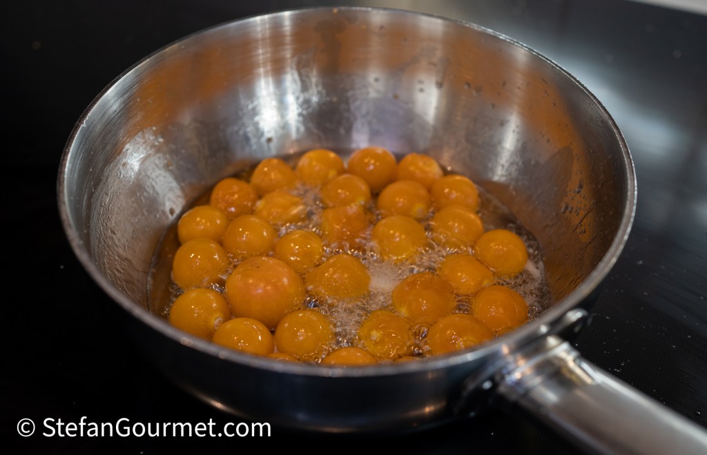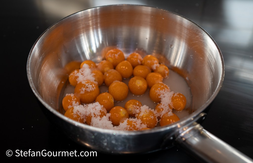 Combine 150 grams of the physalis in a saucepan with 50 grams white sugar and 2 tablespoons of water.