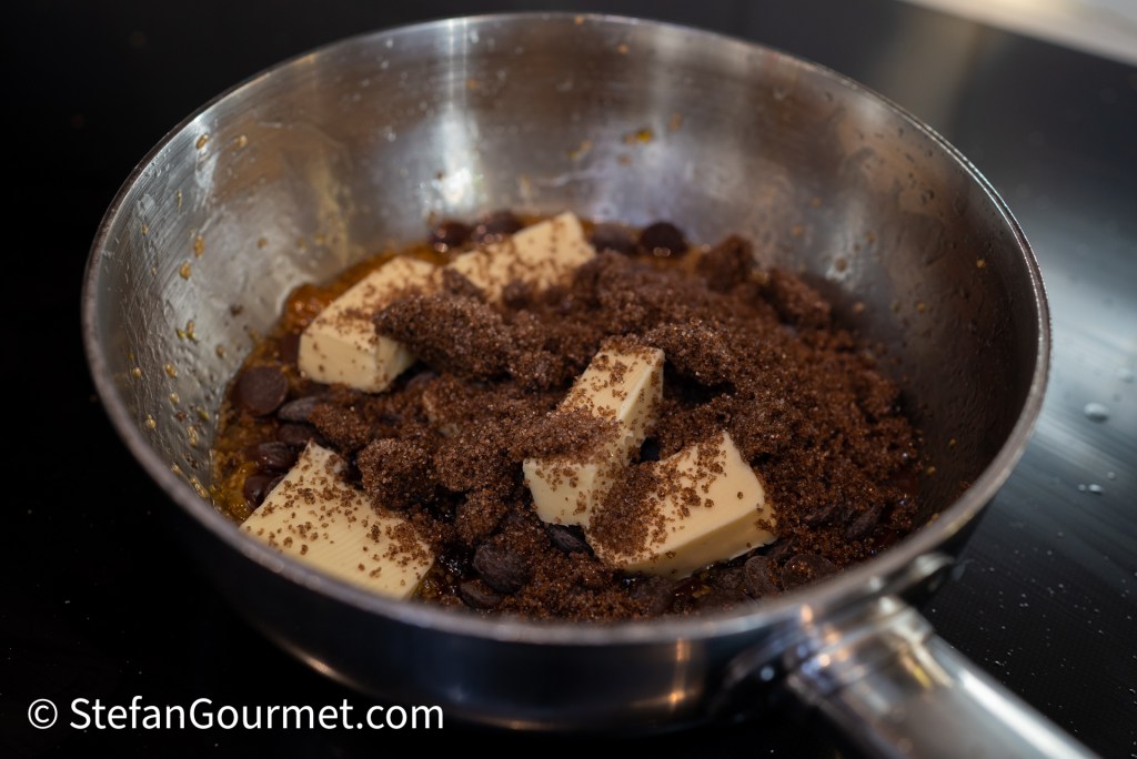 Add 50 grams butter, 100 grams chopped chocolate, and 50 grams dark sugar.