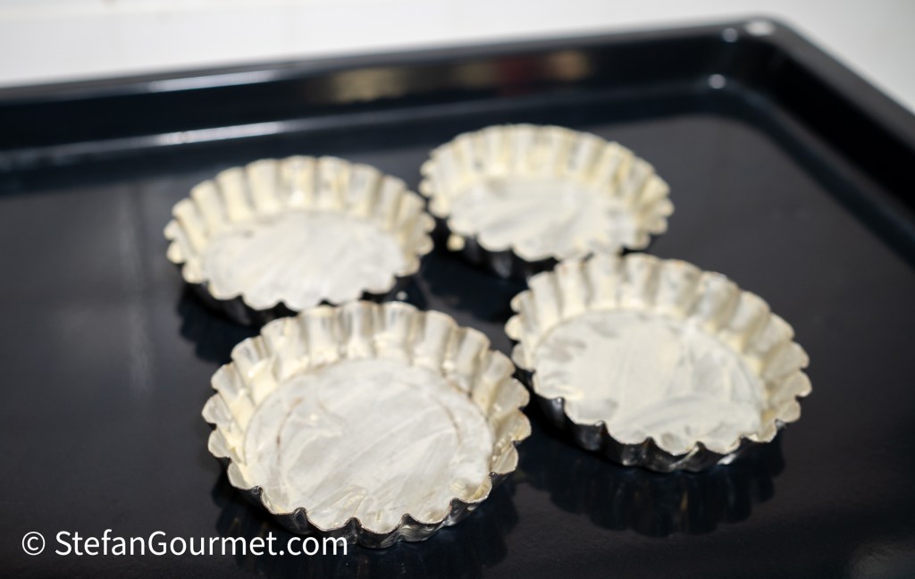 To ensure that you can take the tartlets out of the shape later, it is best to line the bottoms of the shapes with circles of buttered oven paper.