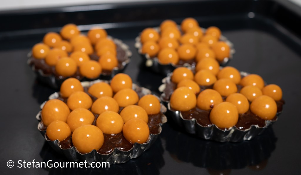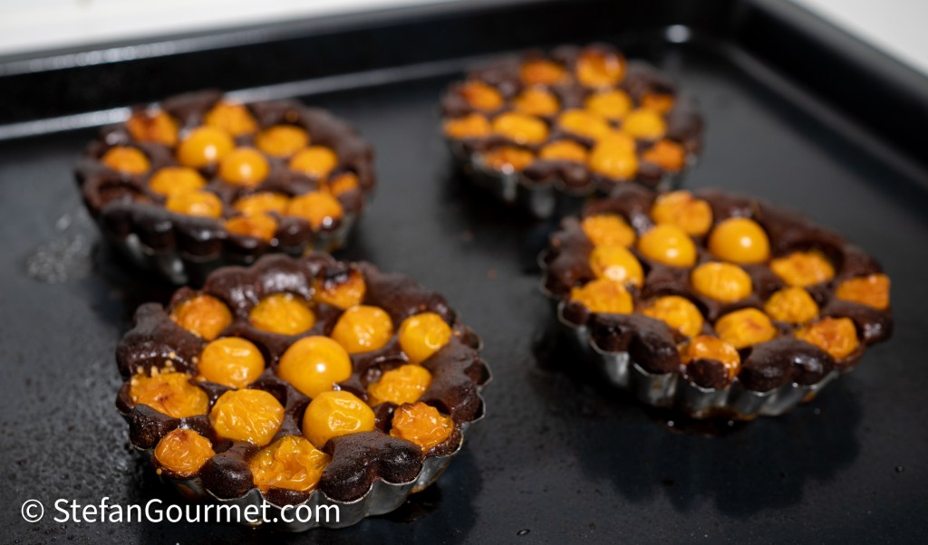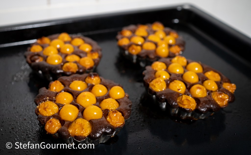 Bake the tartlets for 30-40 minutes at 180C/350F, until the physalis start to wilt and the chocolate has set (test with a toothpick).