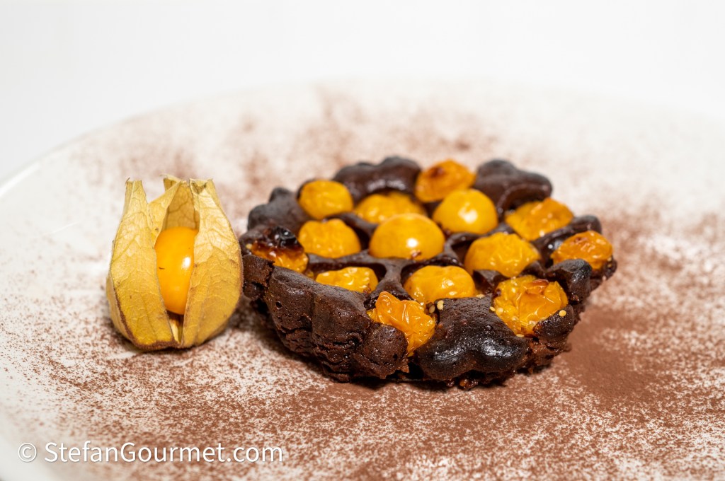 To go with the physalis liquor I created this chocolate and physalis tartlet as a dessert. It turned out delicious and worked very well with the liquor.