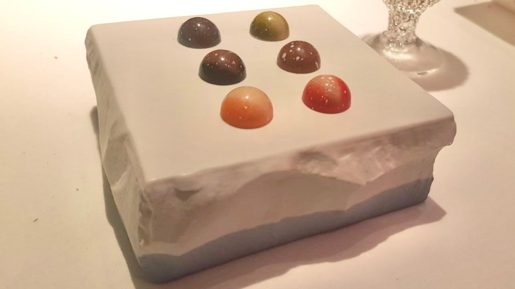 The meal ended with chocolates with ‘echoes’ of flavors from the dishes.